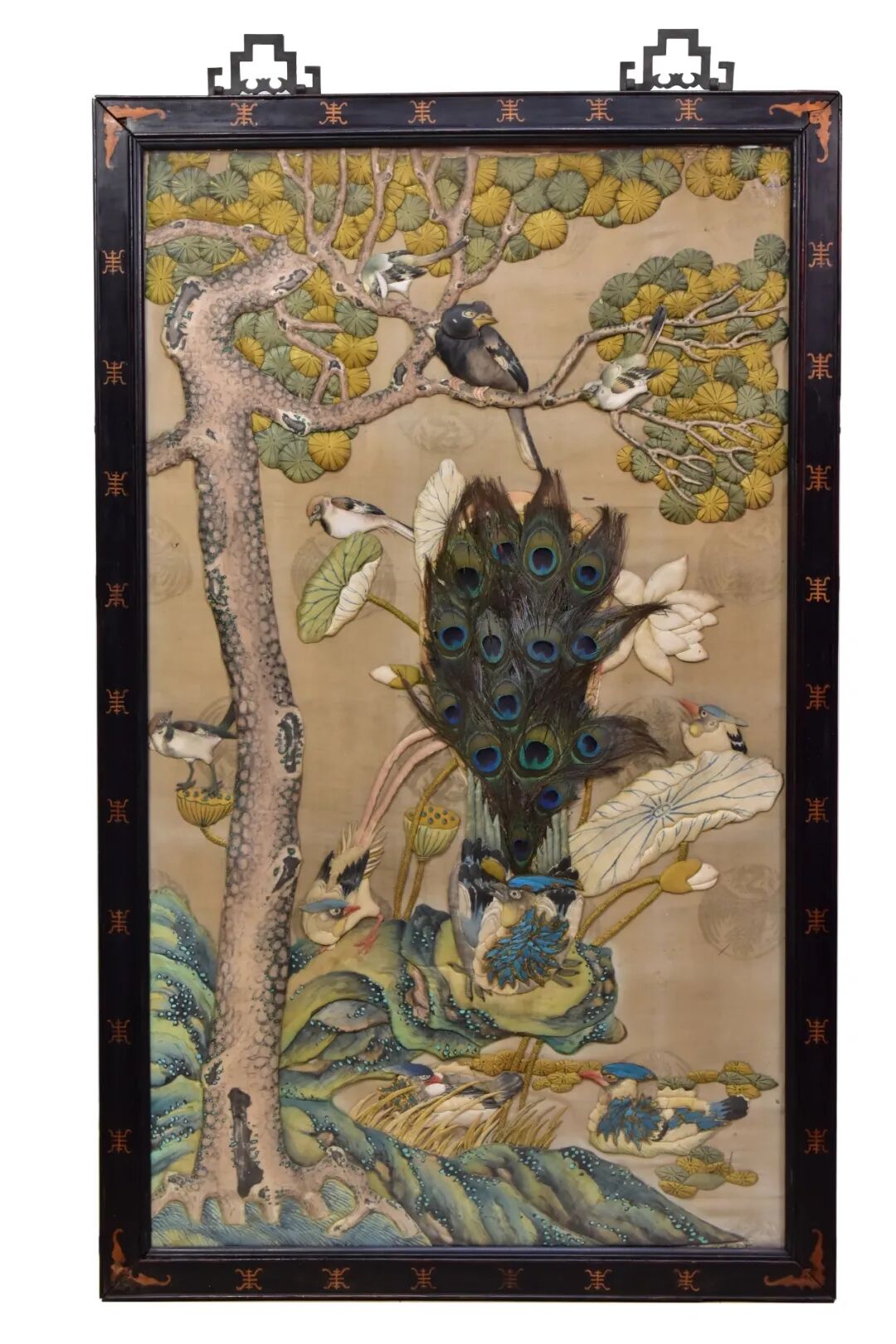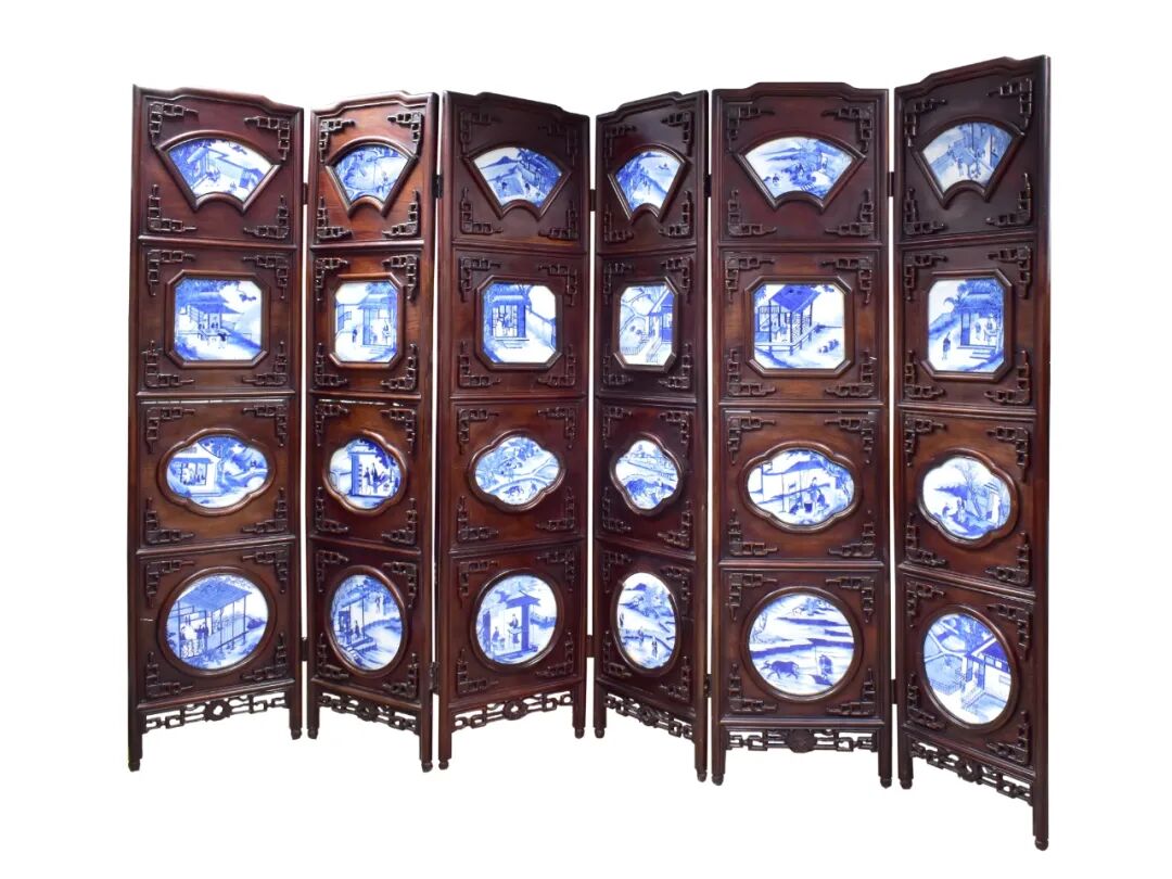 红木青花瓷屏及丝制工艺场景瓷板屏风