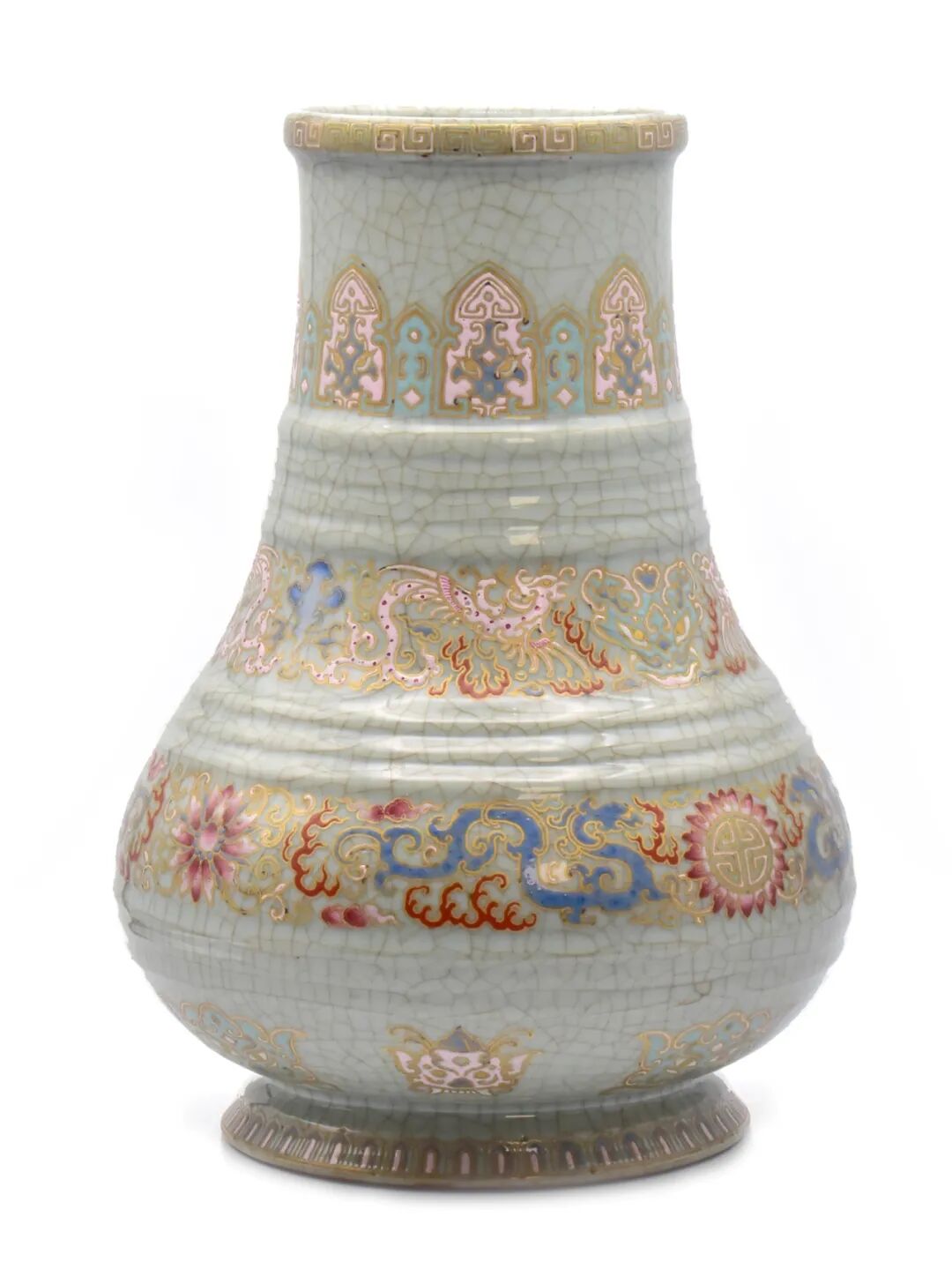 器形受南宋龙泉瓶影响,釉色则追仿南宋官窑或哥釉。瓶身粉彩装饰龙凤纹及饕餮纹,既有仿古又有创新。