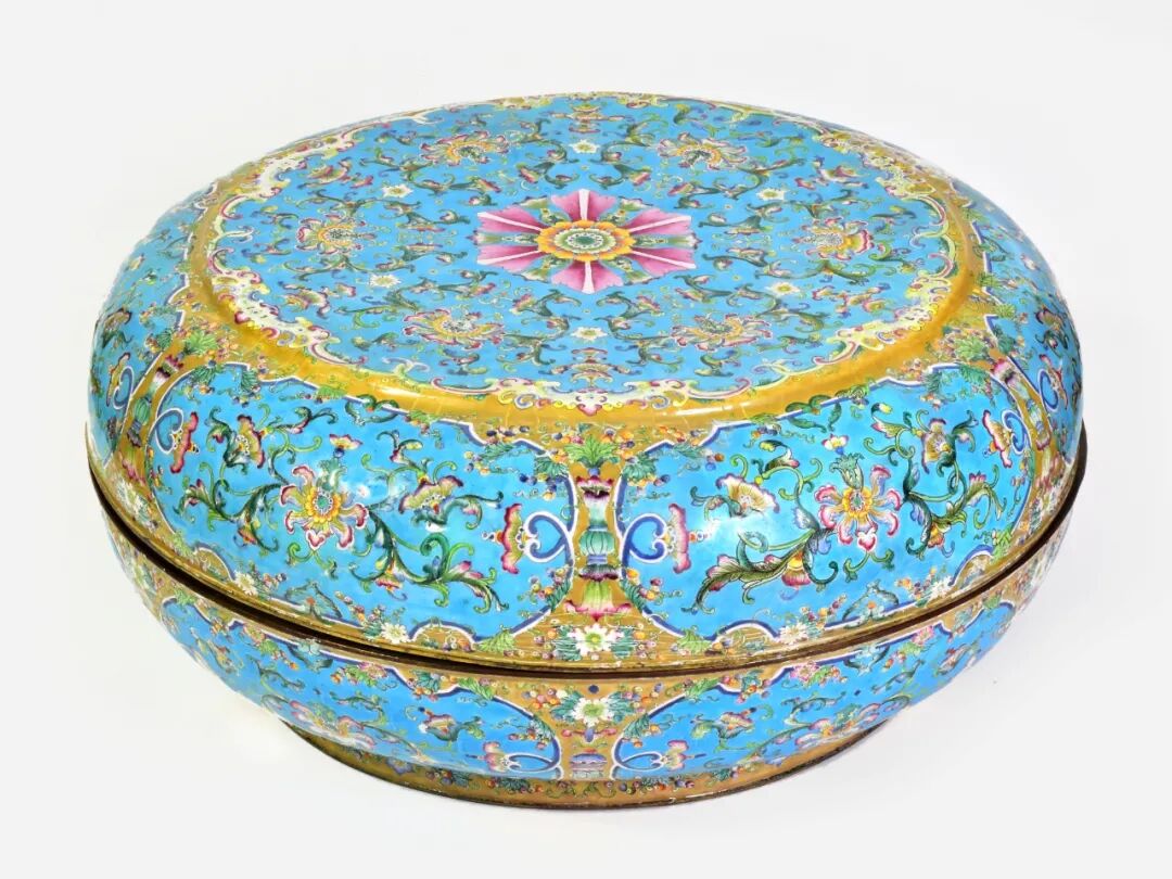 相似一件铜胎画珐琅盒盖,收藏于北京故宫,著录于《故宫珍藏》页245和254,图231和239。