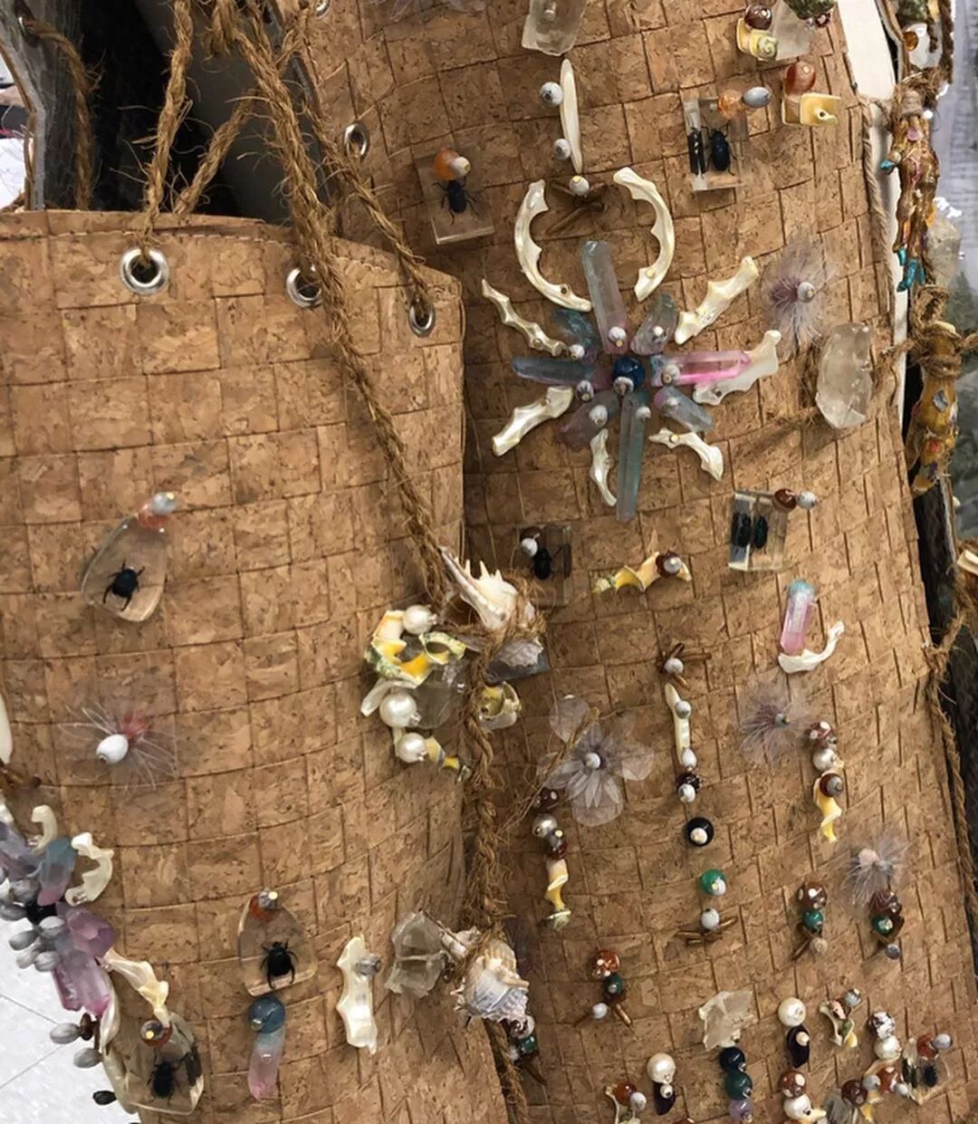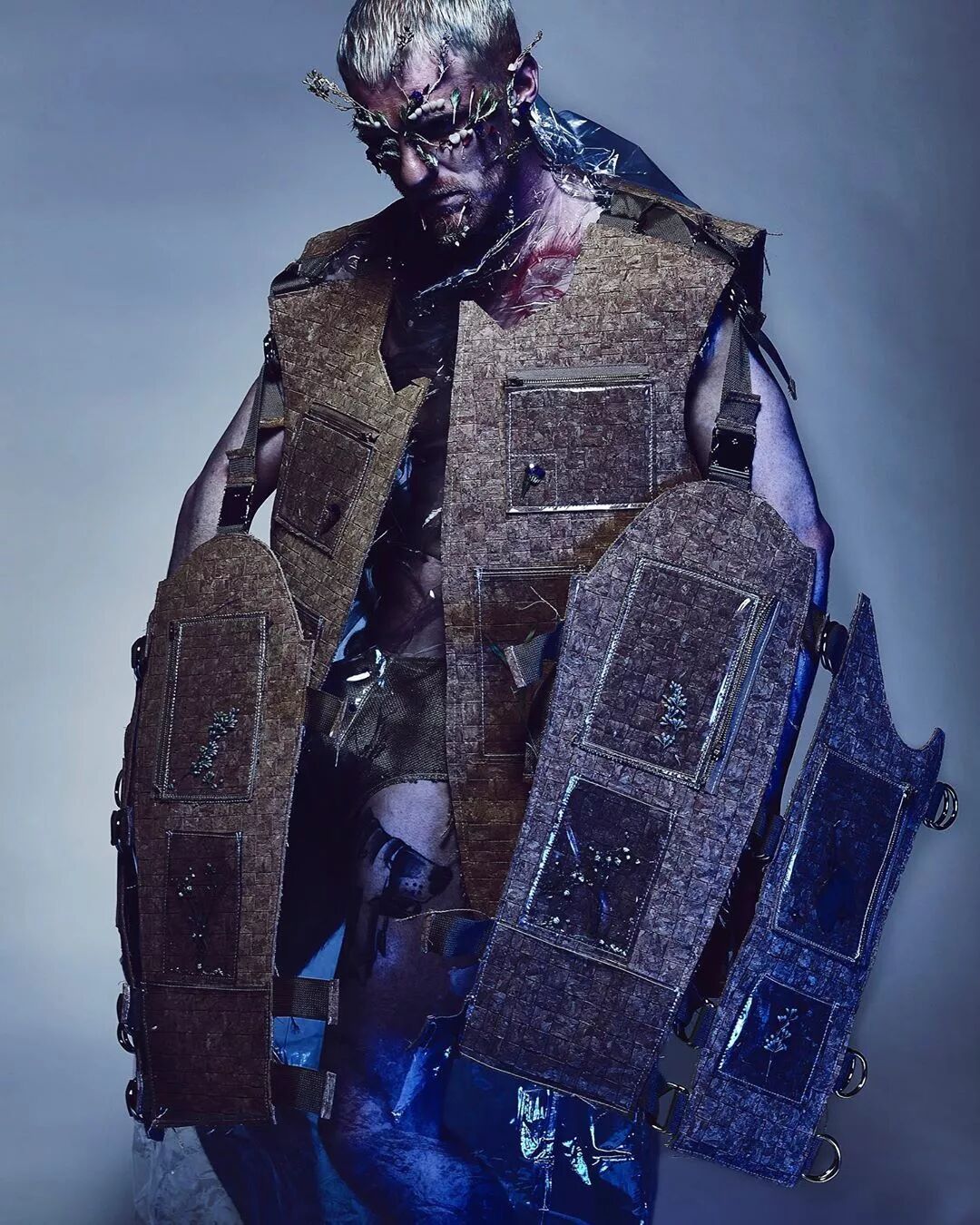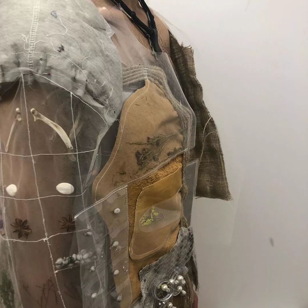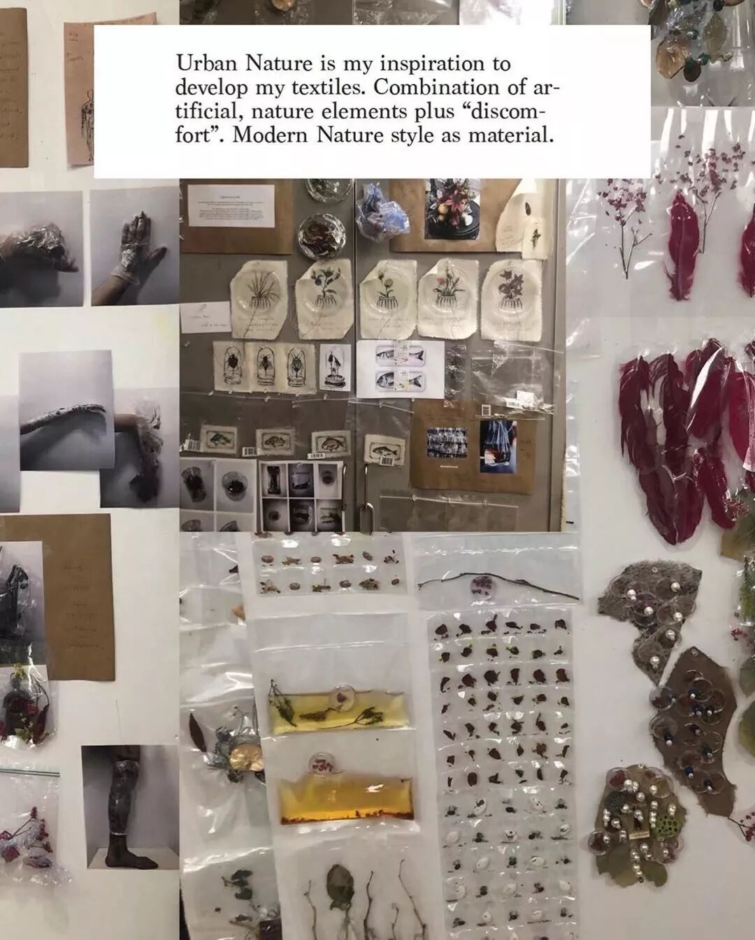 如今人们对于塑料的使用不可避免,对很多人来说塑料是一种被使用过就会丢弃的材料。它难以降解的程度基本上从制作完成就会难于处理,Sho Konishi的毕业系列则把塑料与自然结合起来,将动物尸骨、羽毛、香料、花朵等一些材料密封在塑料里来保存形成“可穿戴档案”,由此作为一种尊重自然与生活的方式。