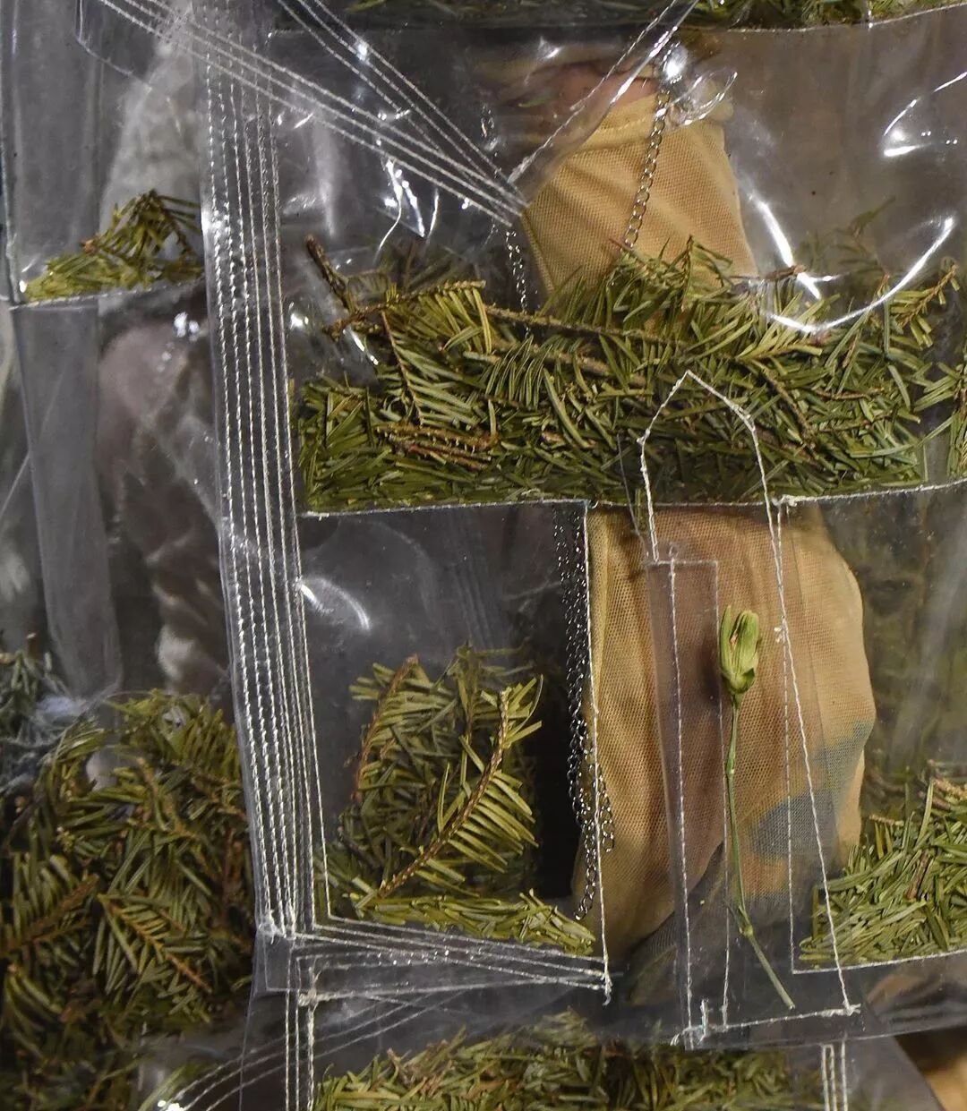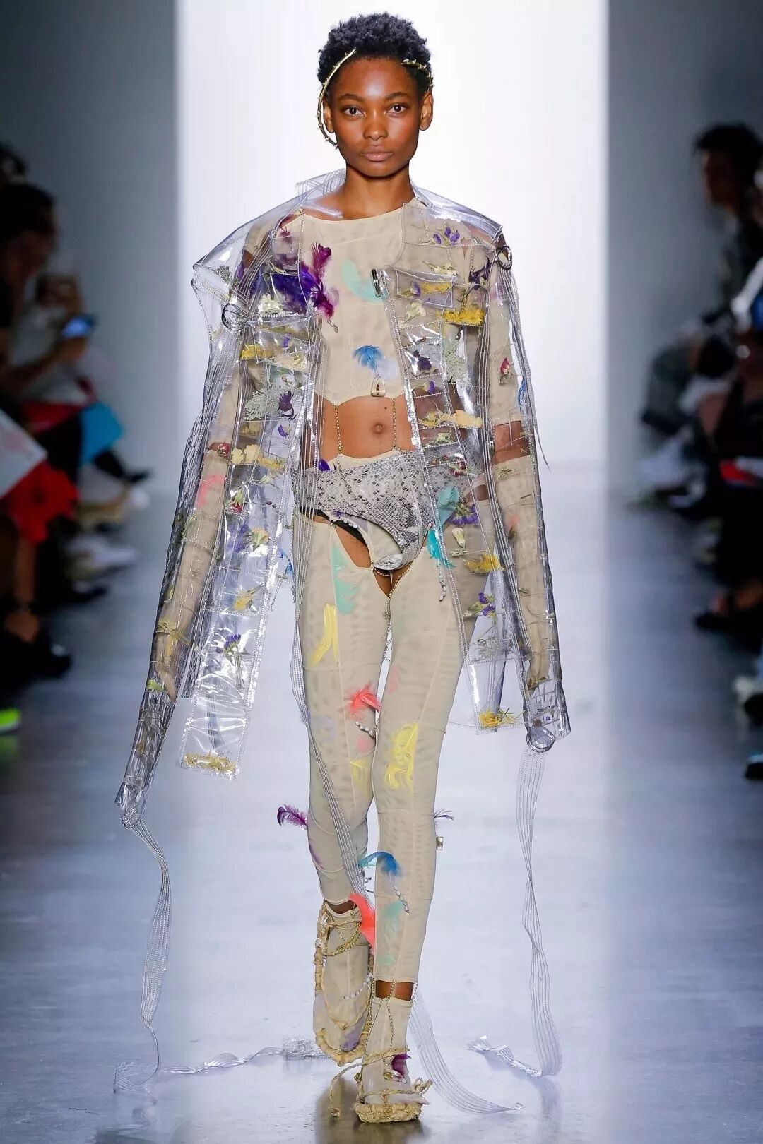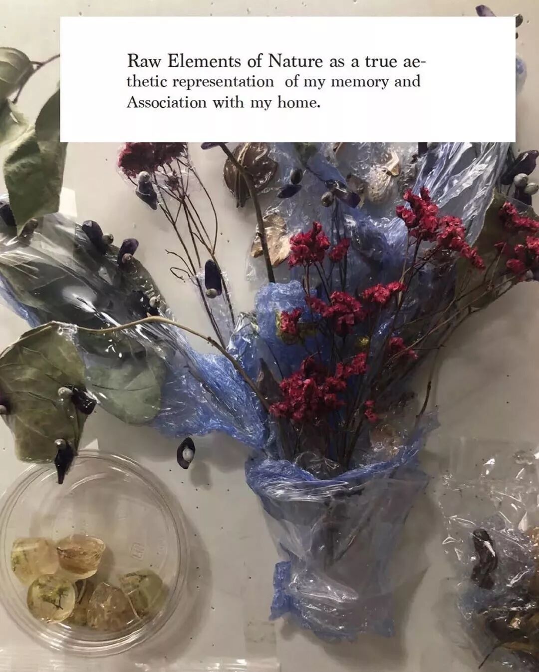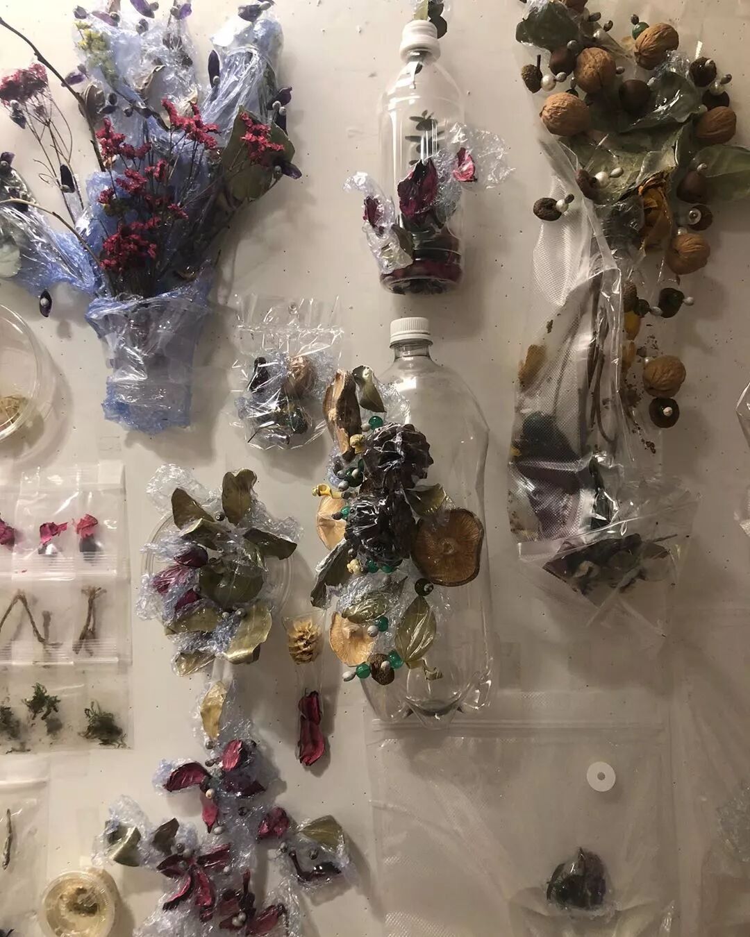 如今人们对于塑料的使用不可避免,对很多人来说塑料是一种被使用过就会丢弃的材料。它难以降解的程度基本上从制作完成就会难于处理,Sho Konishi的毕业系列则把塑料与自然结合起来,将动物尸骨、羽毛、香料、花朵等一些材料密封在塑料里来保存形成“可穿戴档案”,由此作为一种尊重自然与生活的方式。