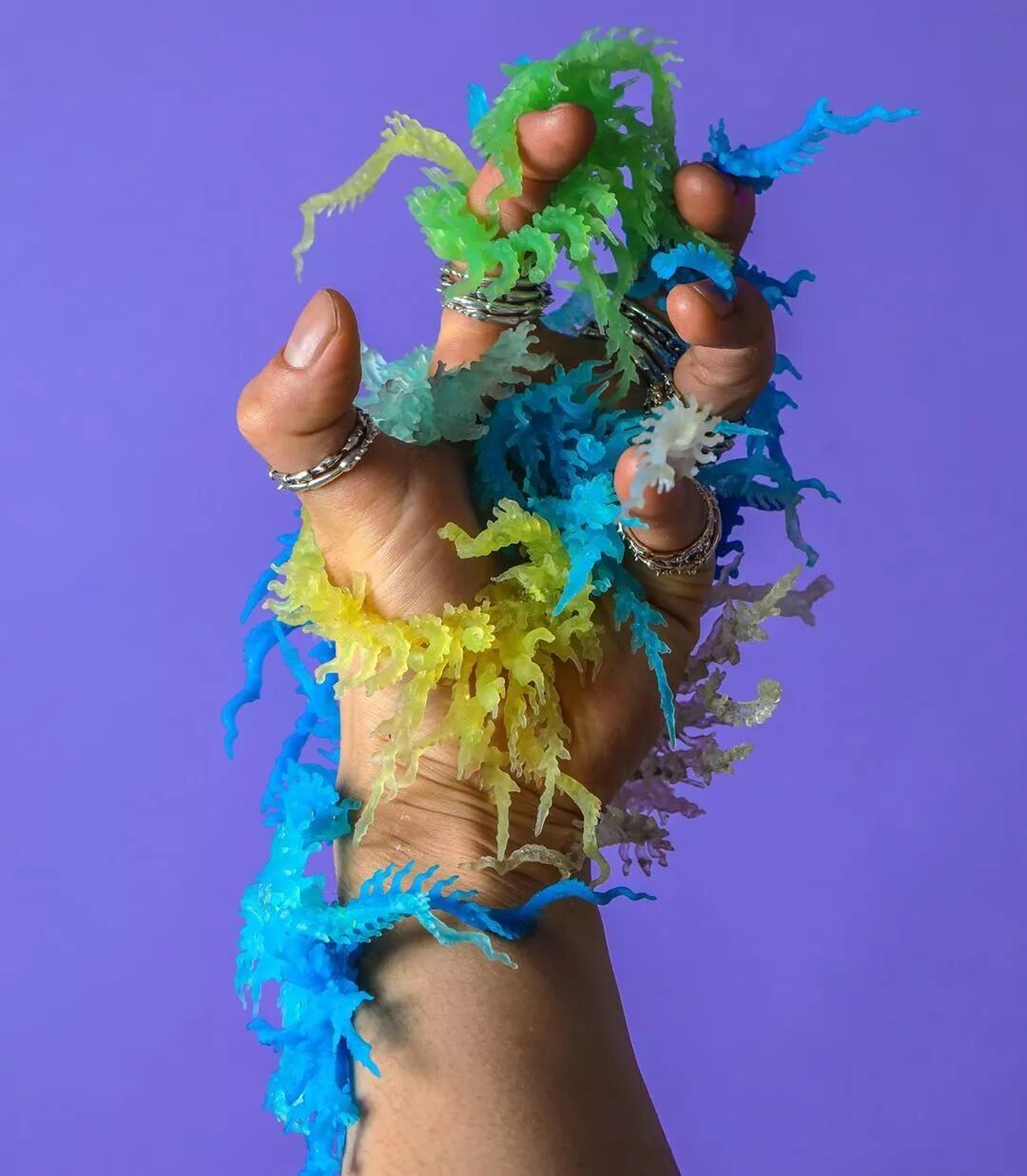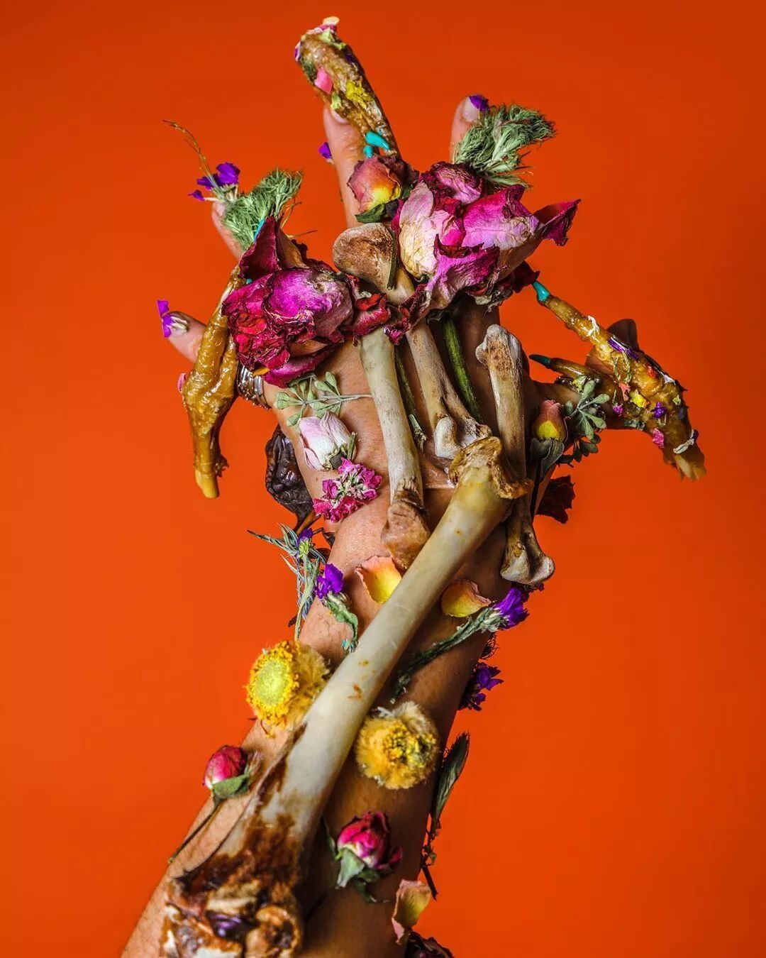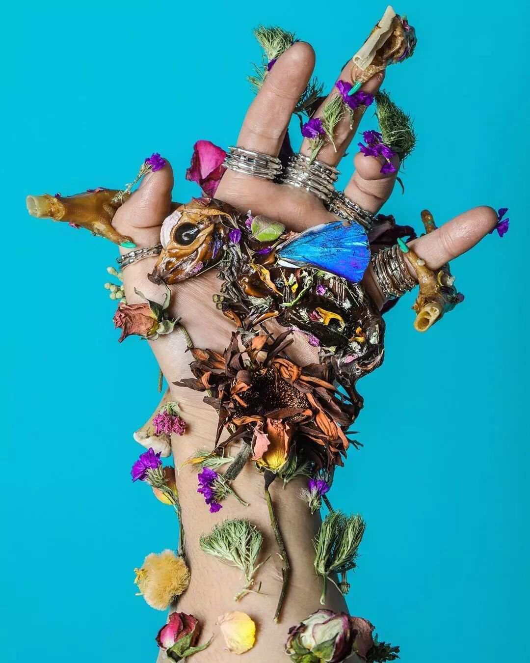 Sho Konishi的共生理念还体现在“素食手套”的创作,Sho会把吃剩的鸡骨头,鲜花,种子等材料风干保存下来,制作出各种奇葩脑洞的手套。