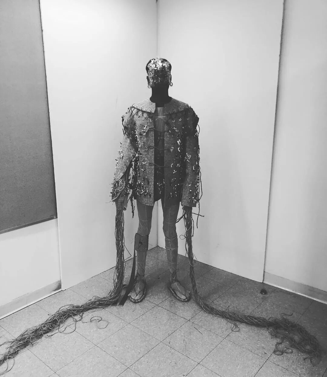 这个披着马皮的造型被叫做“My Horse”,灵感源自Sho Konishi在家乡高知县一家马肉店亲眼目睹的屠宰过程,“每当我进食,我会觉得自己是一个捕食者,用别人的生命维持自己的能量。”通过这次经历,Sho Konishi感受到了内疚、感激与生命强大力量的赞颂,减少浪费,对任何食材我们都应该更加尊重。