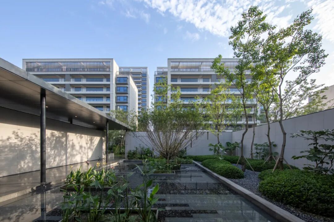 在常州铂悦天宁景观轴线中心偏西的位置有一座静谧花园悄然生长着。将花园作为轴线的焦点,让构筑成为花园里的一个元素,利用规则的构筑边界来突显花园的精致,也让轴线空间富有更多的层次和变化,更好地引导视线落在绿色自然的环境上。