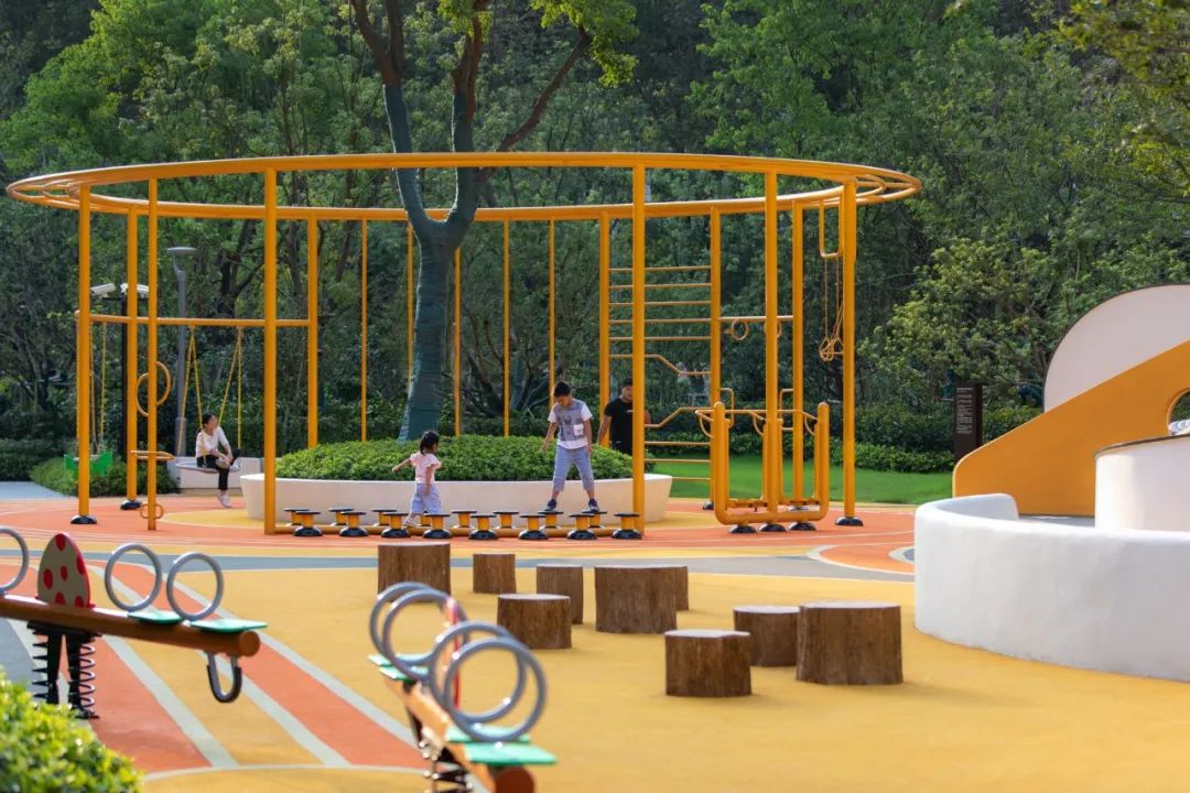 苏州旭辉公元·萃庭首次将“旭辉全龄环”儿童模块落入大区,儿童玩耍器械、成年运动器械和大树有机结合,充分彰显全龄环“功能、经济、自然”的特点,用全龄环,为孩子们预留更多嬉戏奔跑的场地,让孩子以自己的方式去探索树林里的秘密,度过在自然中快乐成长的时光——轻盈的美学。