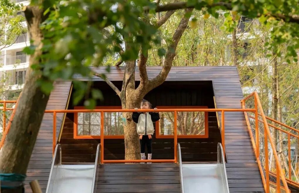 常州都会里在落地时儿童全龄场地时,采用景观挡墙和绿化相结合的方式规避噪音对周边环境的不利影响,高低起伏,虚实结合的挡墙为儿童的活动提供庇护感的同时,也成为了儿童乐园的造型亮点。穿梭其中,仿佛奔跑在山谷林间。