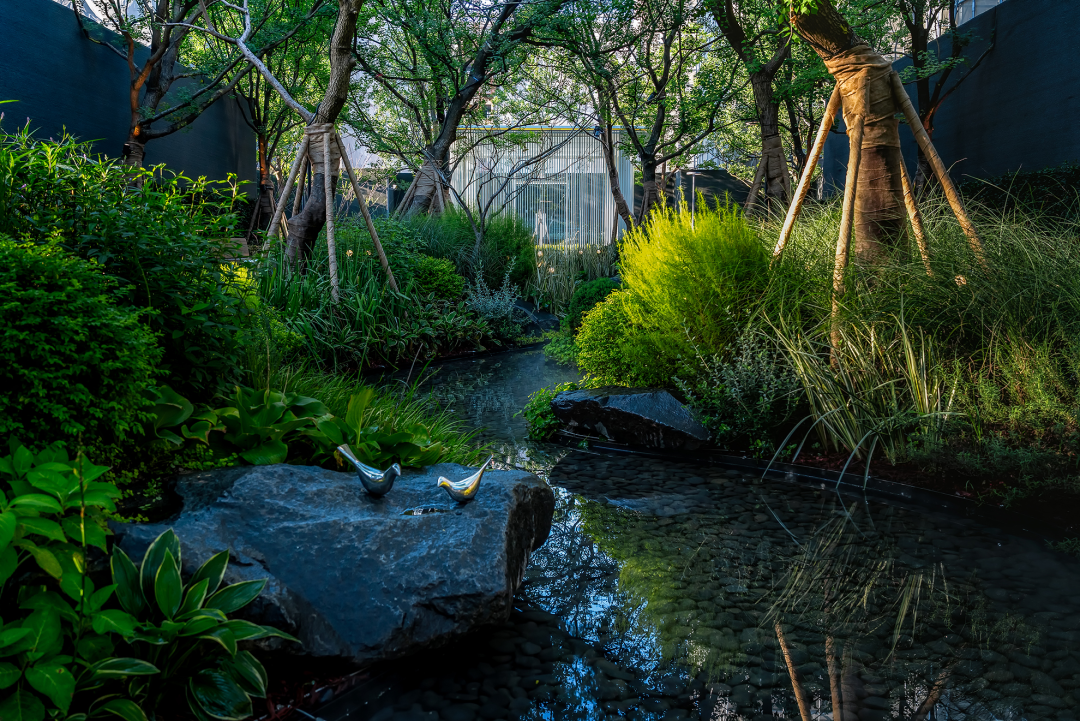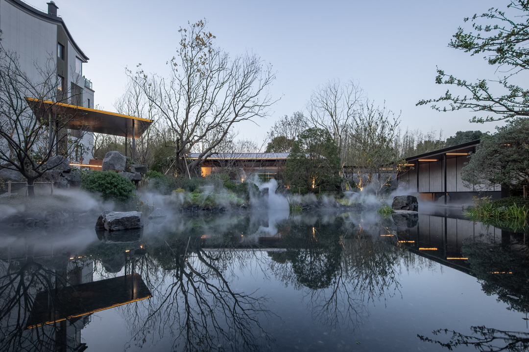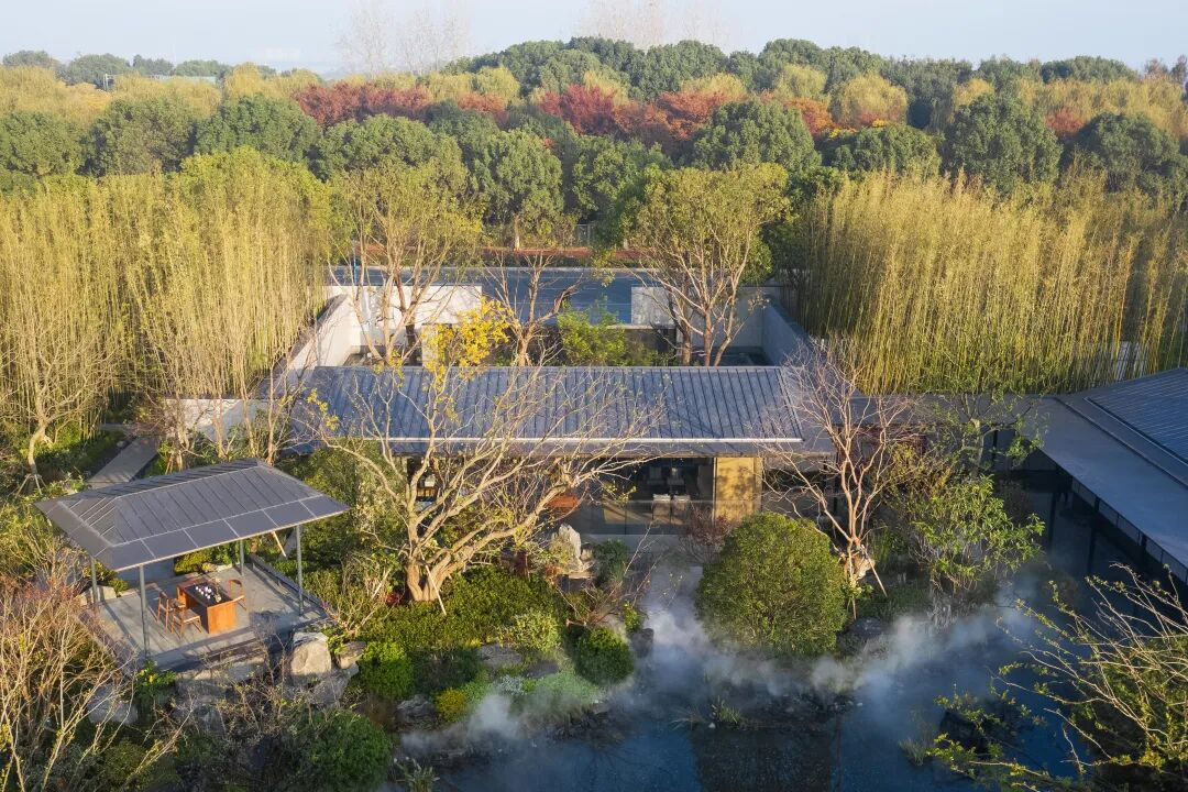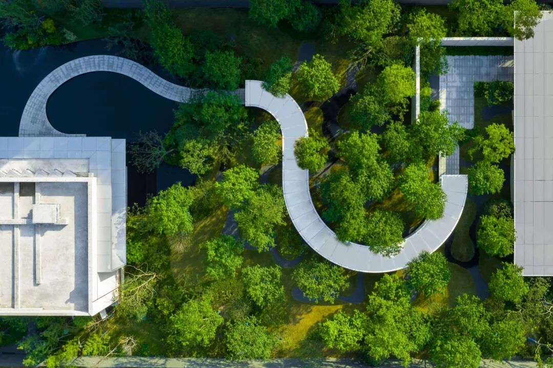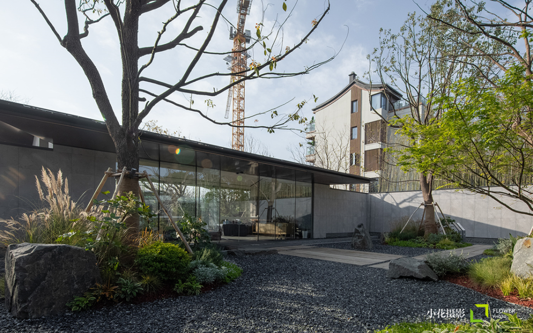 植物手法:结合流线构图,以飘逸的朴树、乌桕为点景大乔,组合形成林下空间。灌木层次分明,与草坪、砾石和水景等形成简洁的构图关系。