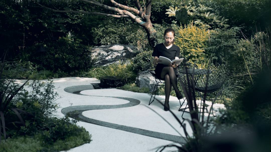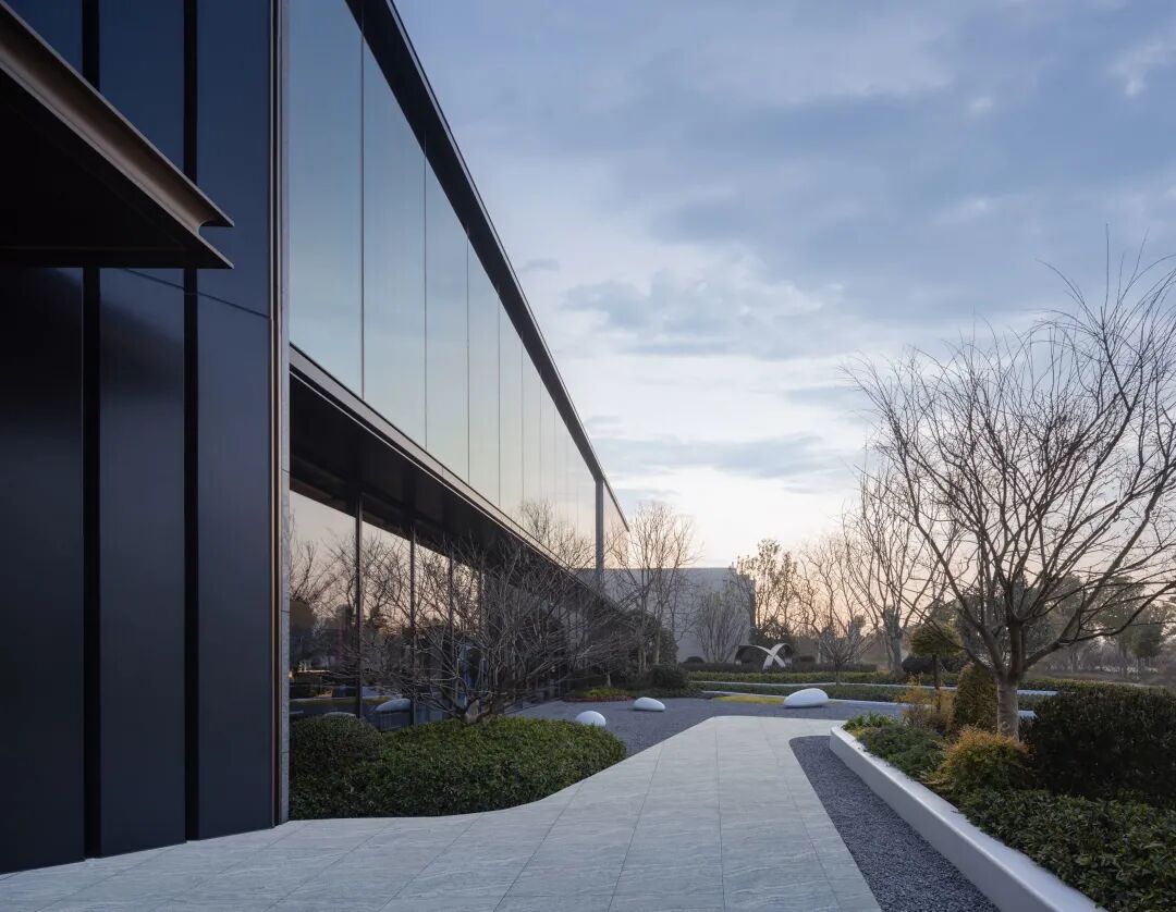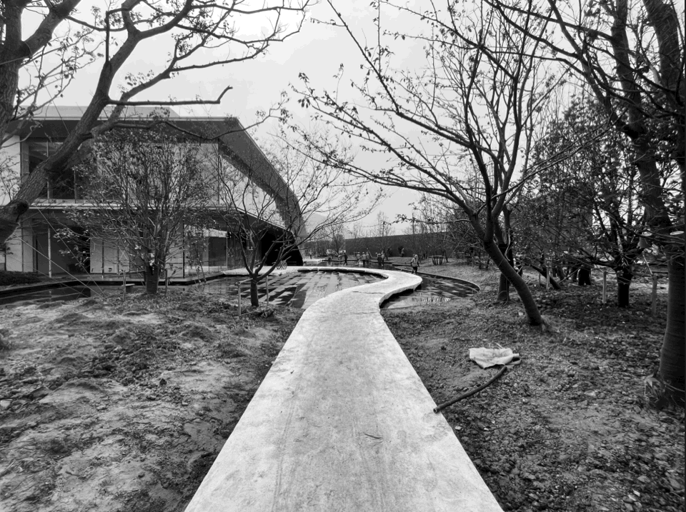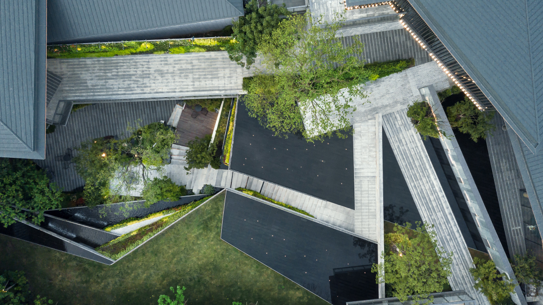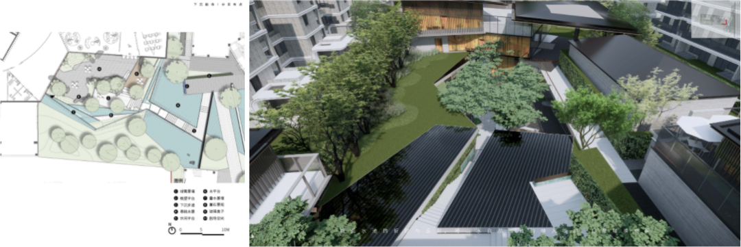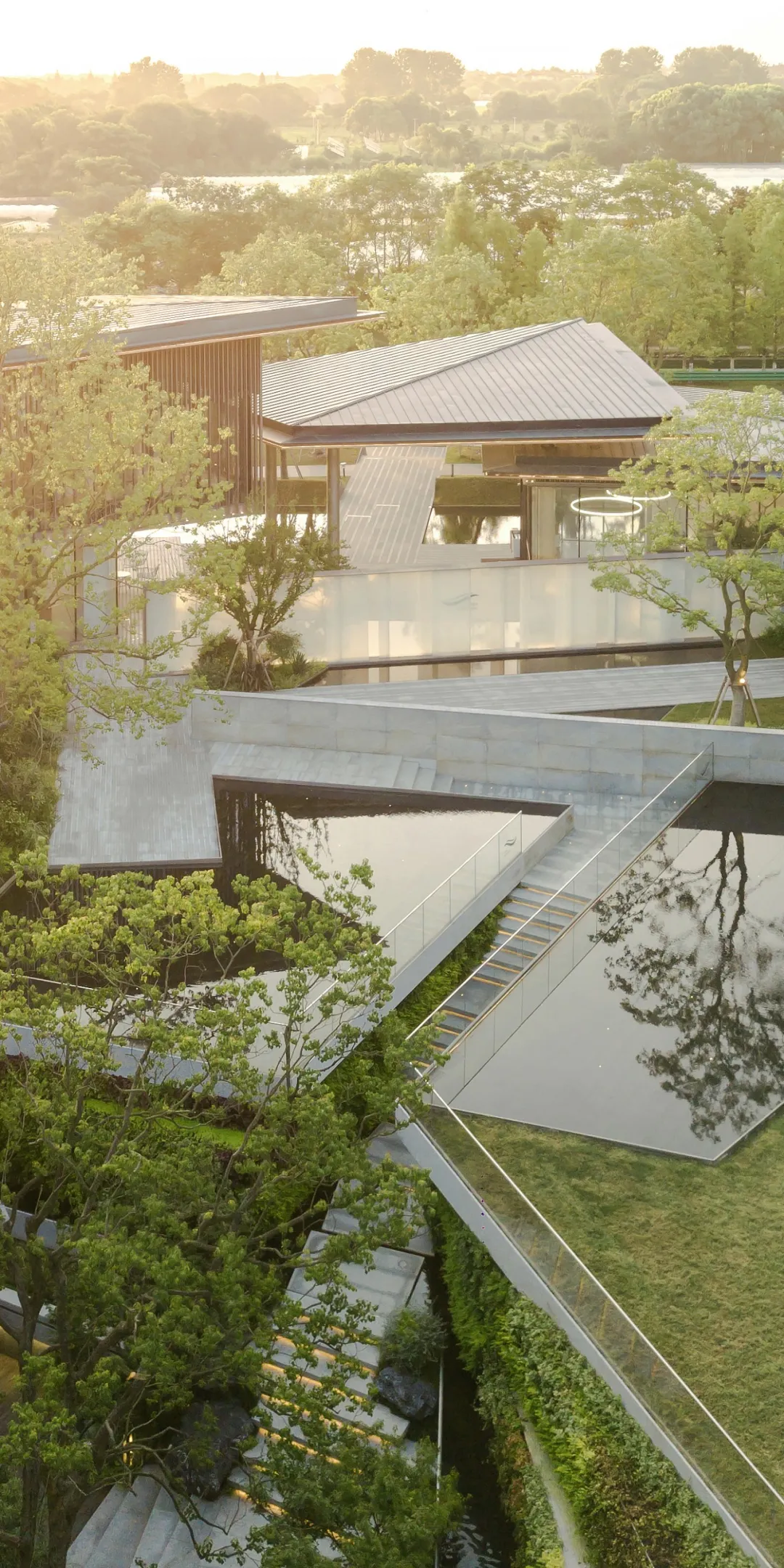 植物手法:结合流线构图,以飘逸的朴树、乌桕为点景大乔,组合形成林下空间。灌木层次分明,与草坪、砾石和水景等形成简洁的构图关系。
