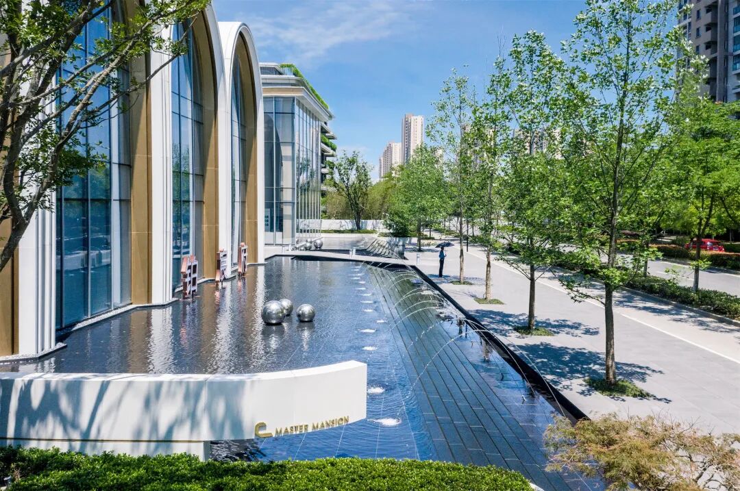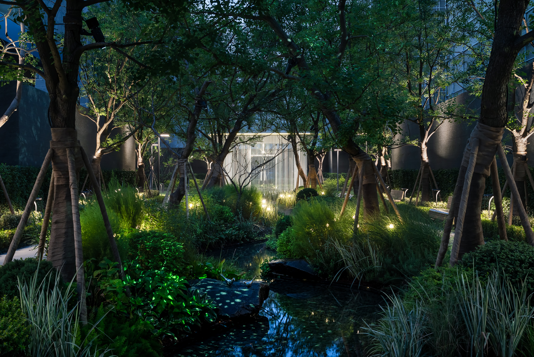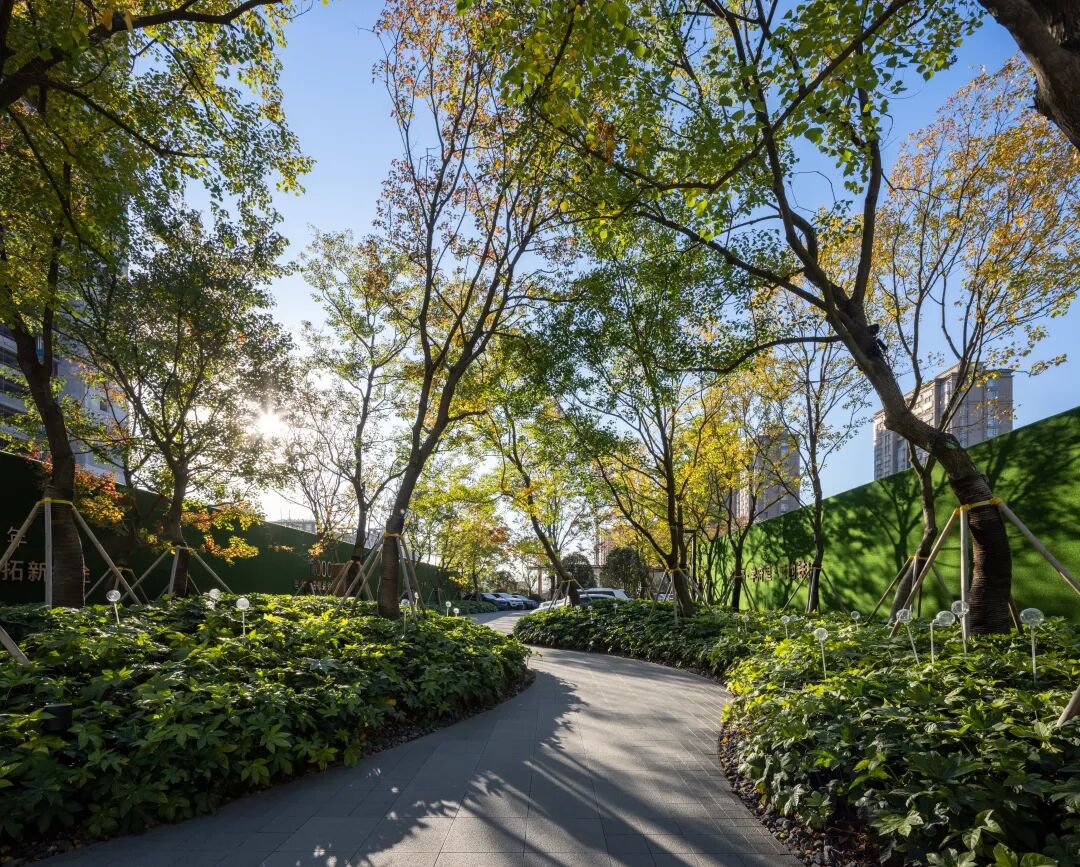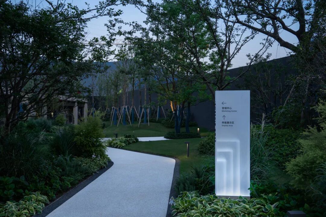 示范区部分呈现的是“林溪川”中轴线的前半段,通过林荫大道、溪流以及丰富的花境,营造出自然但不生硬的归家仪式感。业主过了门厅之后,心情放松下来,出则繁华,入则宁静。