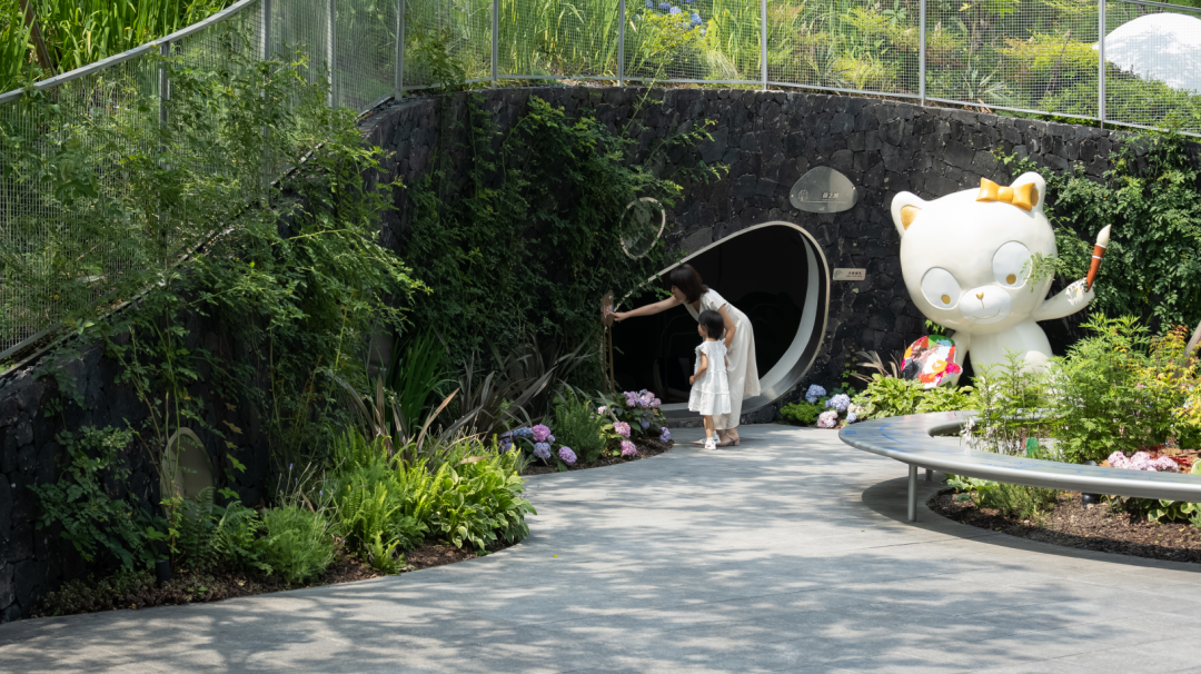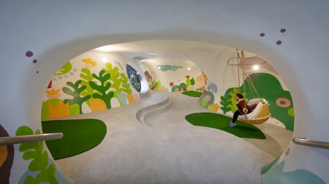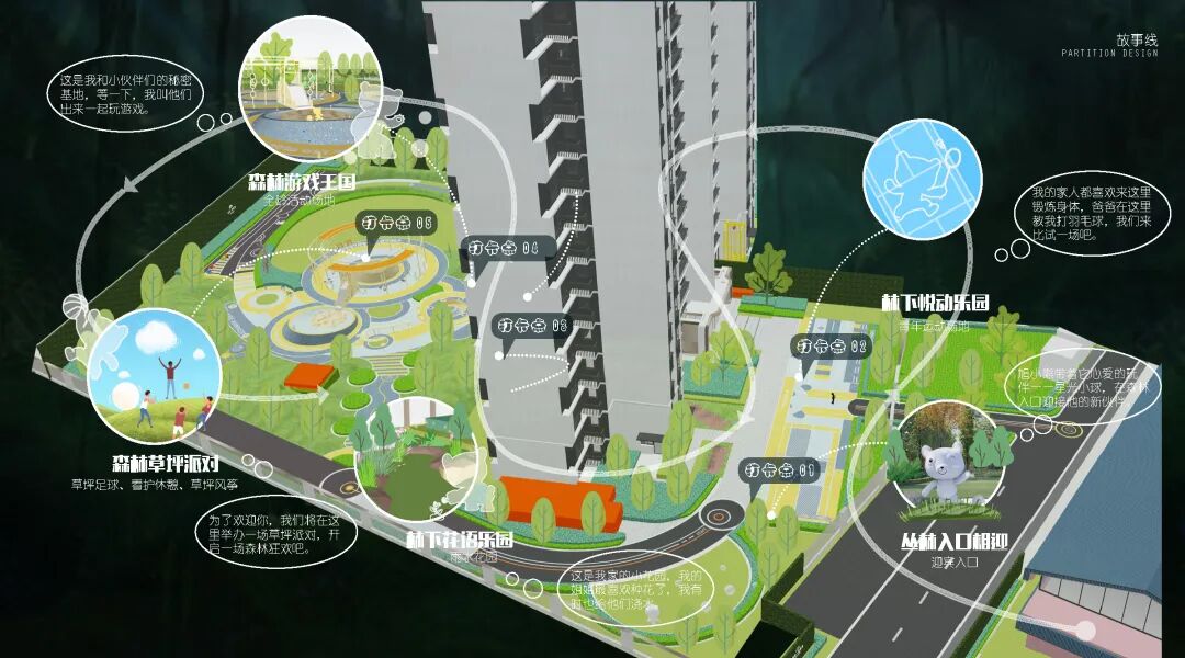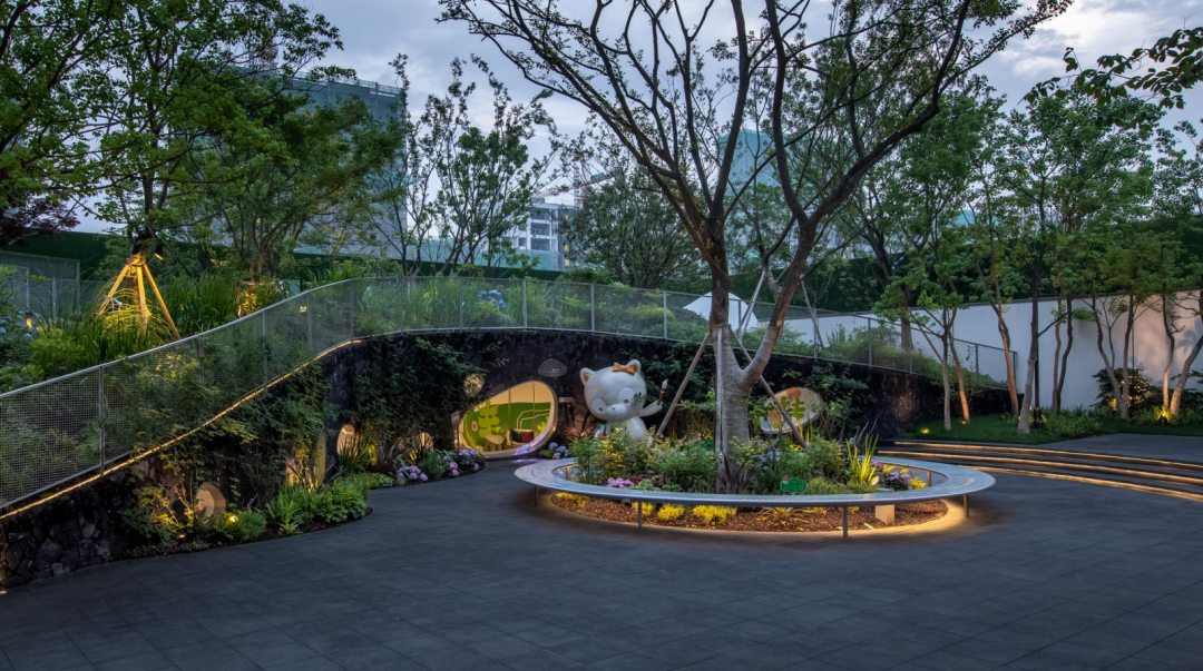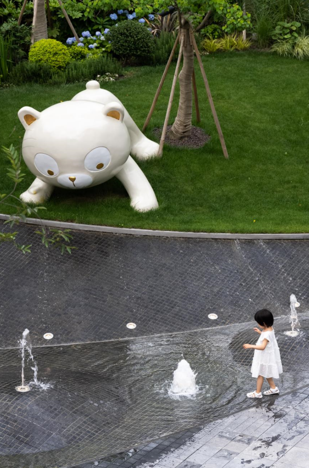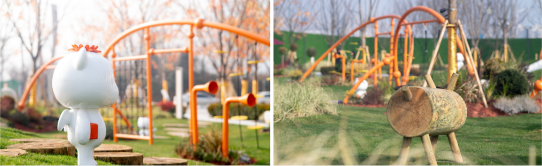 具体的细节还设计了有趣的小鸟饮水雕塑、“百鸟归林熊出没”的丛林+logo以及舒适的路边长椅,这些细节无一不体现了江苏旭辉所倡导的“自然、有趣、有人情味的”理念。