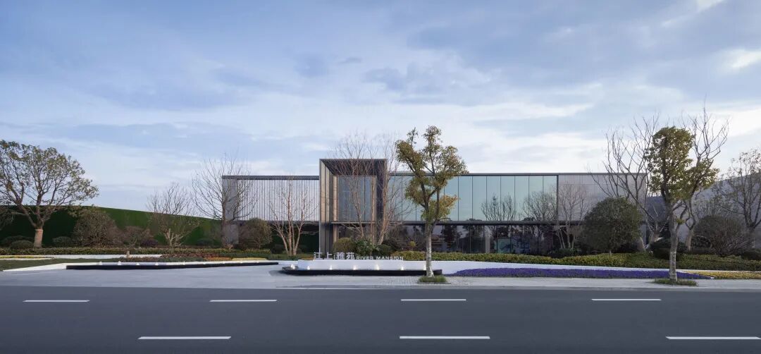 前场水苑:微笑景墙借用市政乔木做林带背景,隔绝市政外的不利因素,丰富从售楼部看出来的景观视野;