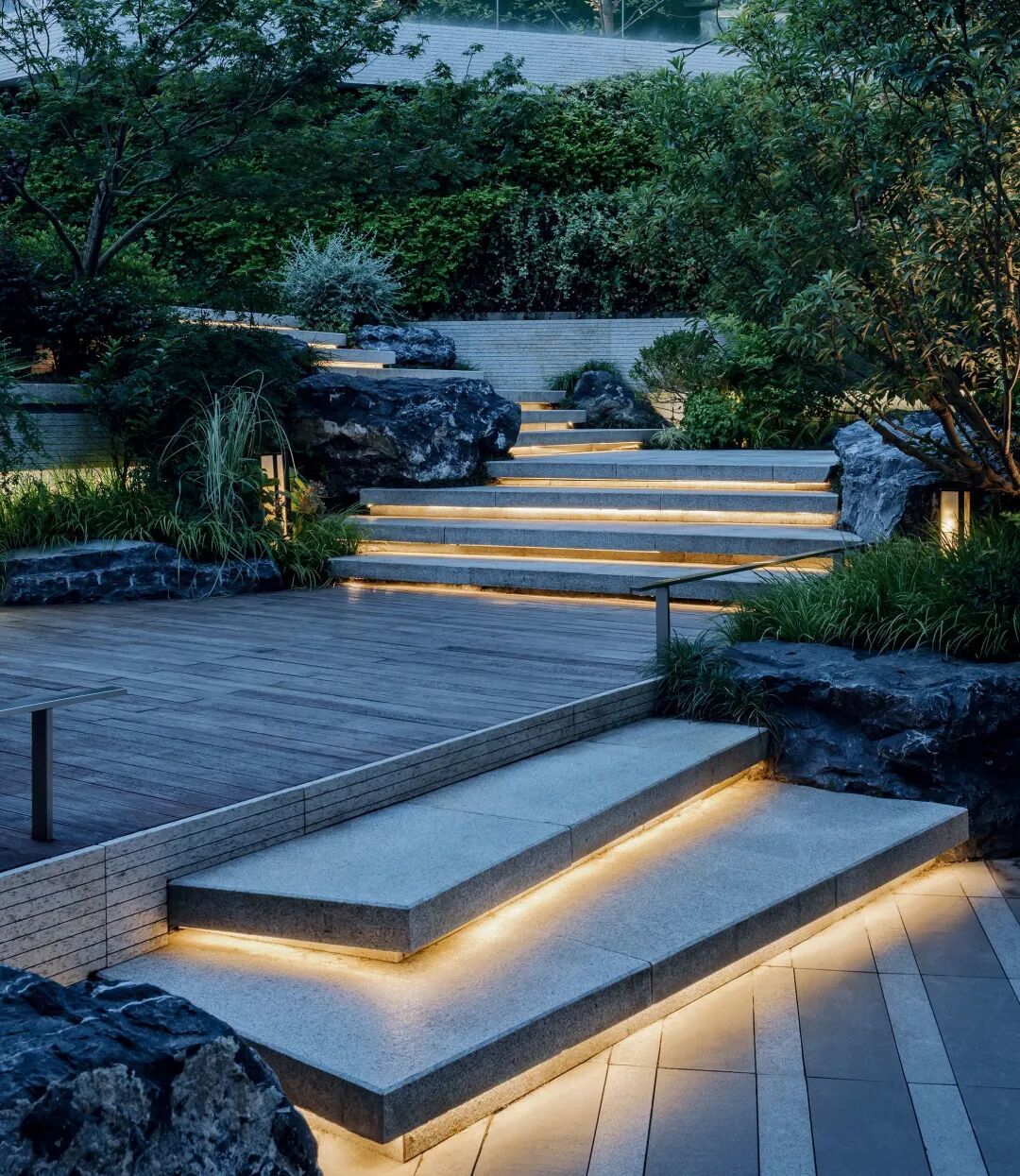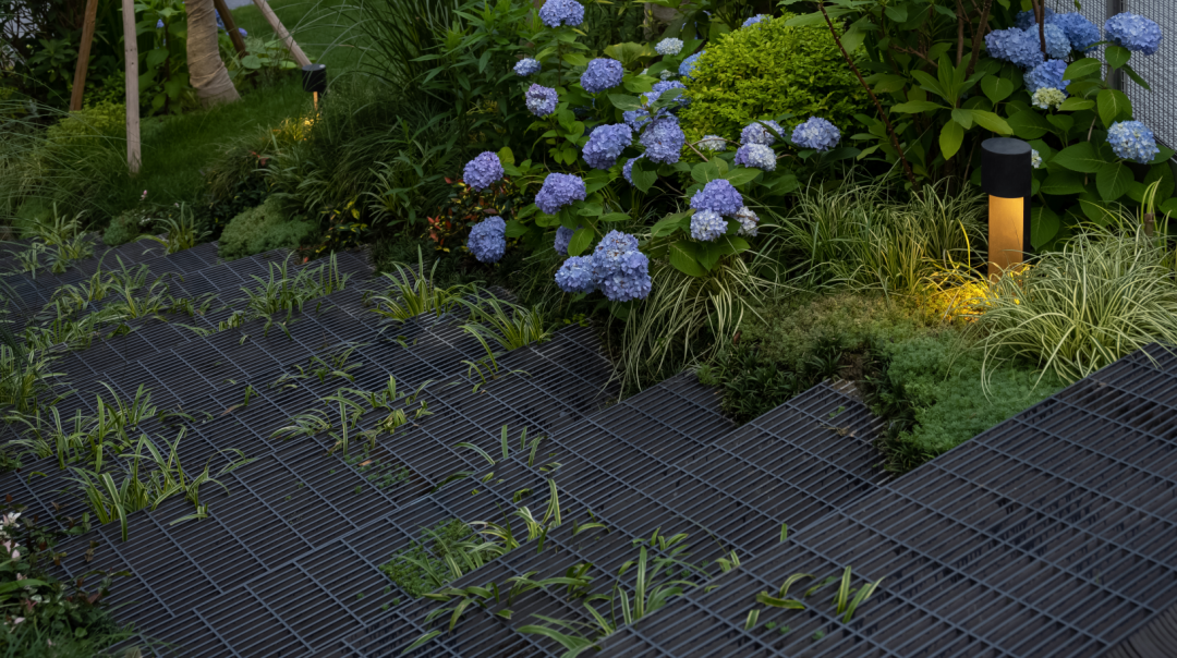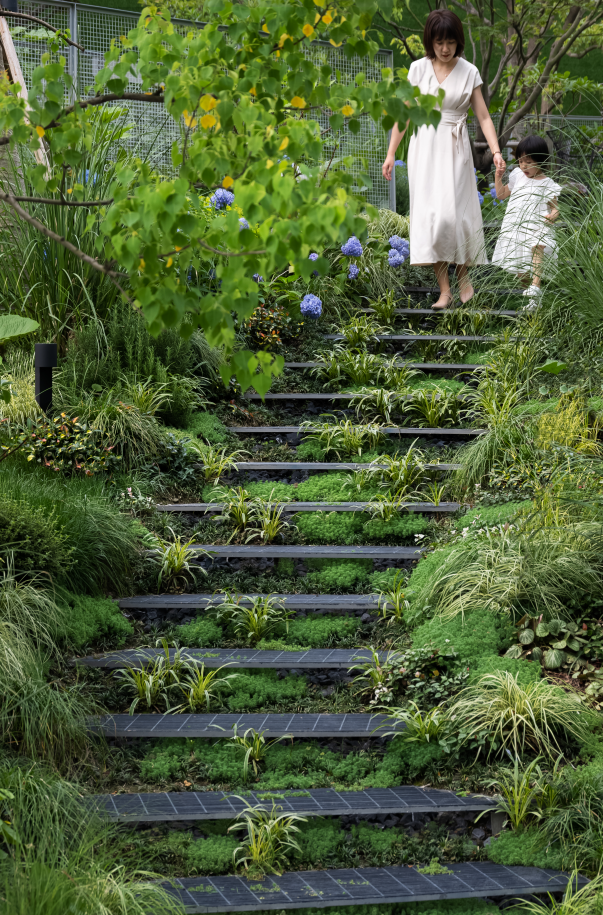 金属网格汀步台阶的“穿透”感,植物生长消解了软硬的边界↑