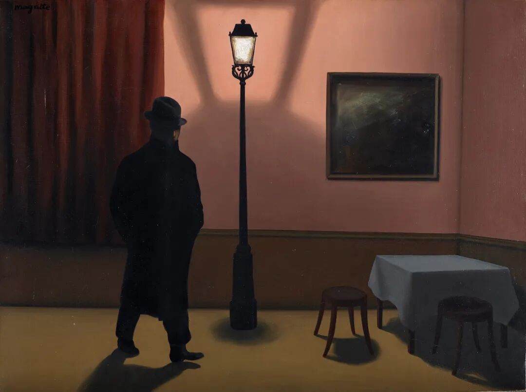 马格利特的绘画风格是渐进的,一步步探索最后形成一套完整的逻辑,以至于当现在我们一看到矛盾的画面风格,比如幽深的街道、昏暗的街灯、影影绰绰的树木、阴暗不明的房子,再配上明亮的蓝天,这种类似舞台布景的奇异组合,就知道这很大概率是马格利特1950到1960年代的作品。