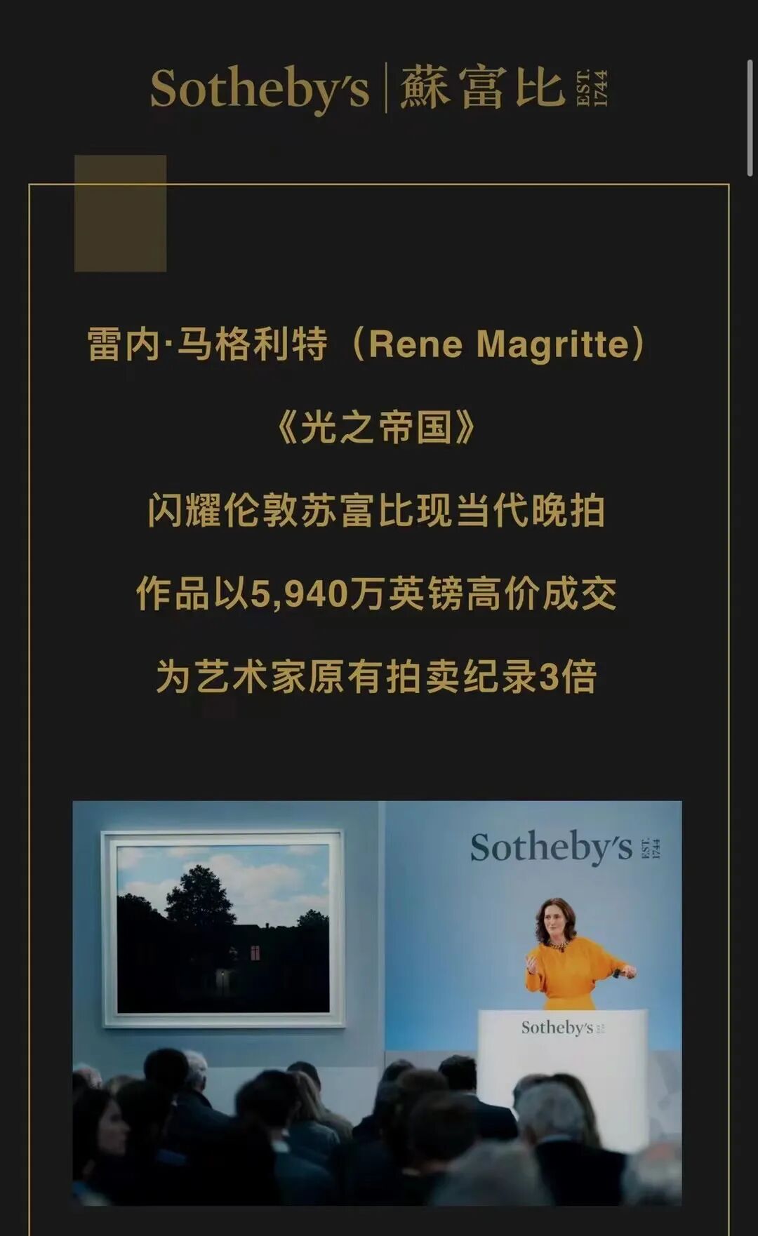 我觉得吧,除开本身是一流的作品外,这几个因素的叠加,都算这次马格利特作品能再破记录的关键原因。