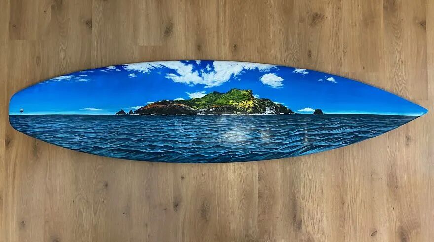 冲浪板的造型并不适合绘画,不过,对于经验丰富的克莱尔玛丽来说,拿冲浪板去绘画十分简单,她不仅可以给冲浪板绘制一幅漂亮的风景画,连细节部分也非常精彩,在她的冲浪板绘画作品里,大多都是与海边风景相关,用冲浪板绘制大海的景象,看到这些风景画作就会让人联想起,大海与冲浪这项运动。