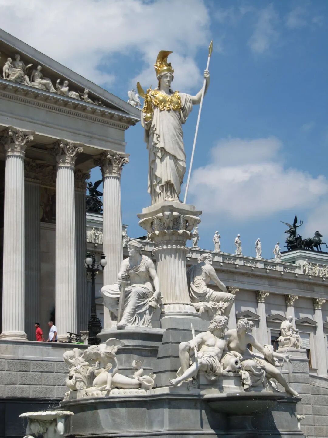 维也纳法院前广场的以雅典娜为首的众神群像喷泉,胸甲上嵌有美杜莎的头颅,头戴罗马盔,右手与克利姆特的《雅典娜》一样持Nike雕像,左手持矛