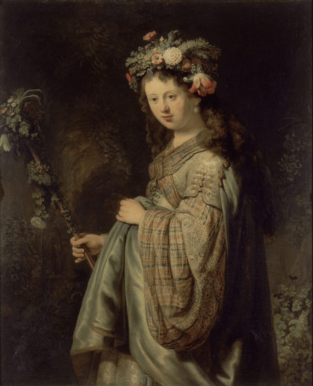 而伦勃朗作品的第二个特征,是经常出现一个胖胖的女性,这名女性正是他的夫人莎斯基亚(Saskia van Uylenburgh),伦勃朗非常爱她,以至于在各种神话、宗教题材里,会让莎斯基亚以各种形象出镜!