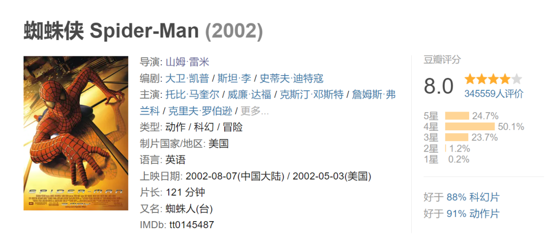 其中《蜘蛛侠》系列首部在豆瓣上也有8.0的高分。