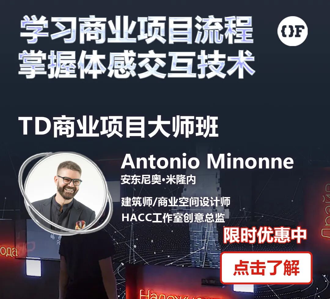 所以一个好的商业活动企划,以及新奇的交互体感元素可以让你的产品和作品都得到很大程度的魅力提升!Of Course 也联合上海交互工作室总监 Antonio Minonne(安东尼奥·米隆内)为大家带来了全新的 TD 商业项目大师班!