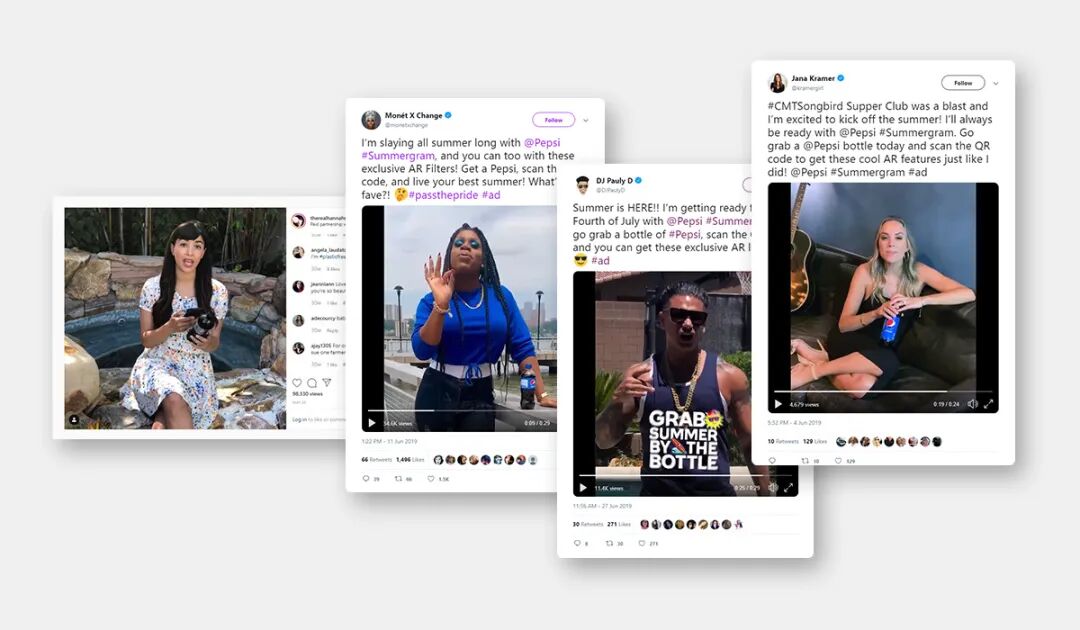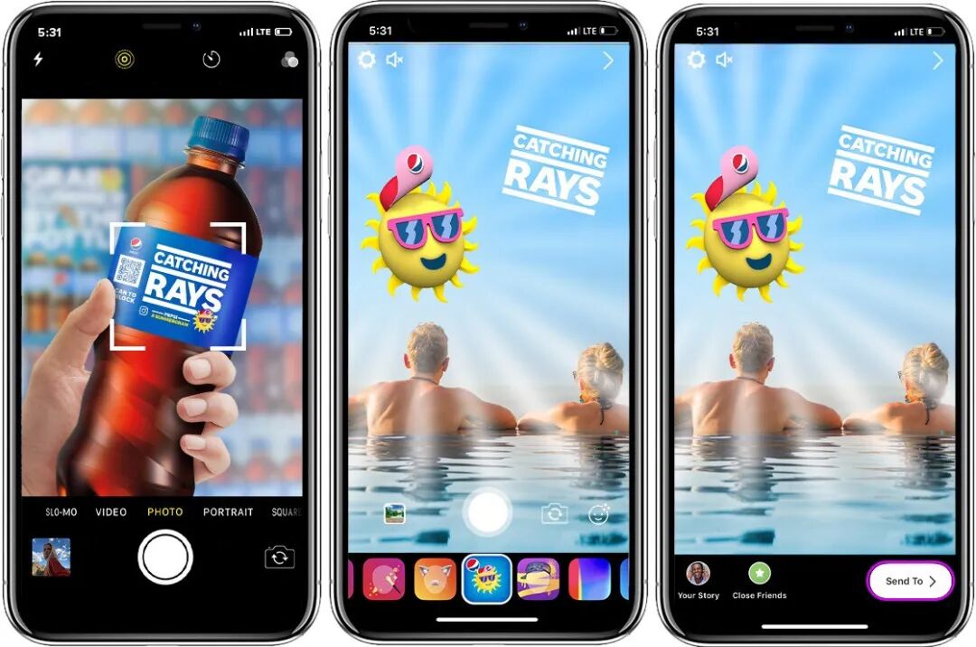 百世可乐为这次的夏季活动命名为 #SUMMERGRAM,在虚拟端它联合了 Instagram 推出了全新的 Spark AR 平台。他们制作了超过 250 多种独特的 AR 效果,每一种都基于百事可乐的元素制作。