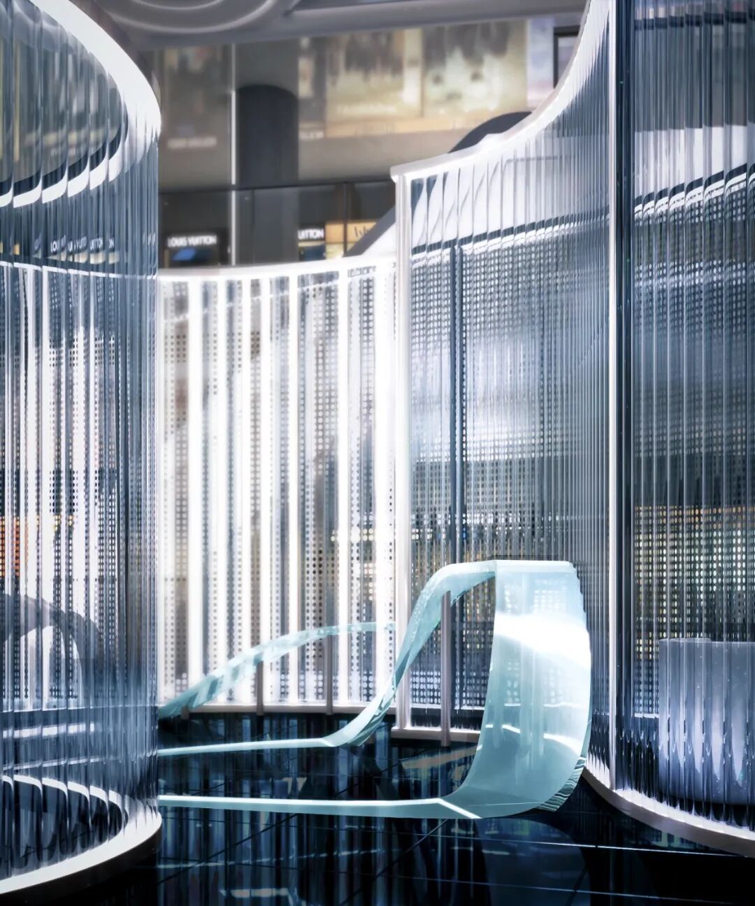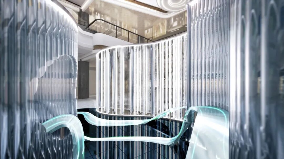 这件作品的外观设计灵感来自卷轴纸,地面采用了山水流线造型的元素,墙壁则是竹林的感觉,并且通体的圆形特征表示了佛教中的“圆融状态”。
