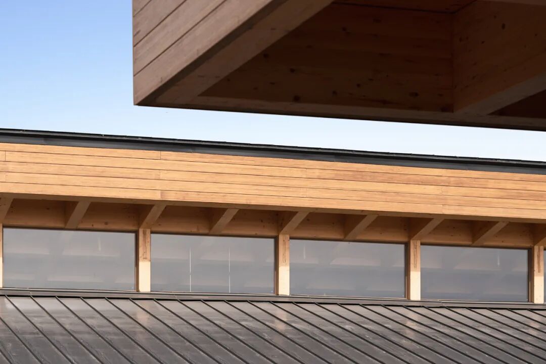 云杉实木与钢结构相接,具有轻便的结构特性,为构建多元的空间提供了无限可能。室内屋面的檩条和椽条位于同一平面内,木质框架结构不做修饰裸露在外,营造休闲商业气息的同时,秩序分明的搭接将结构美体现得淋漓尽致。