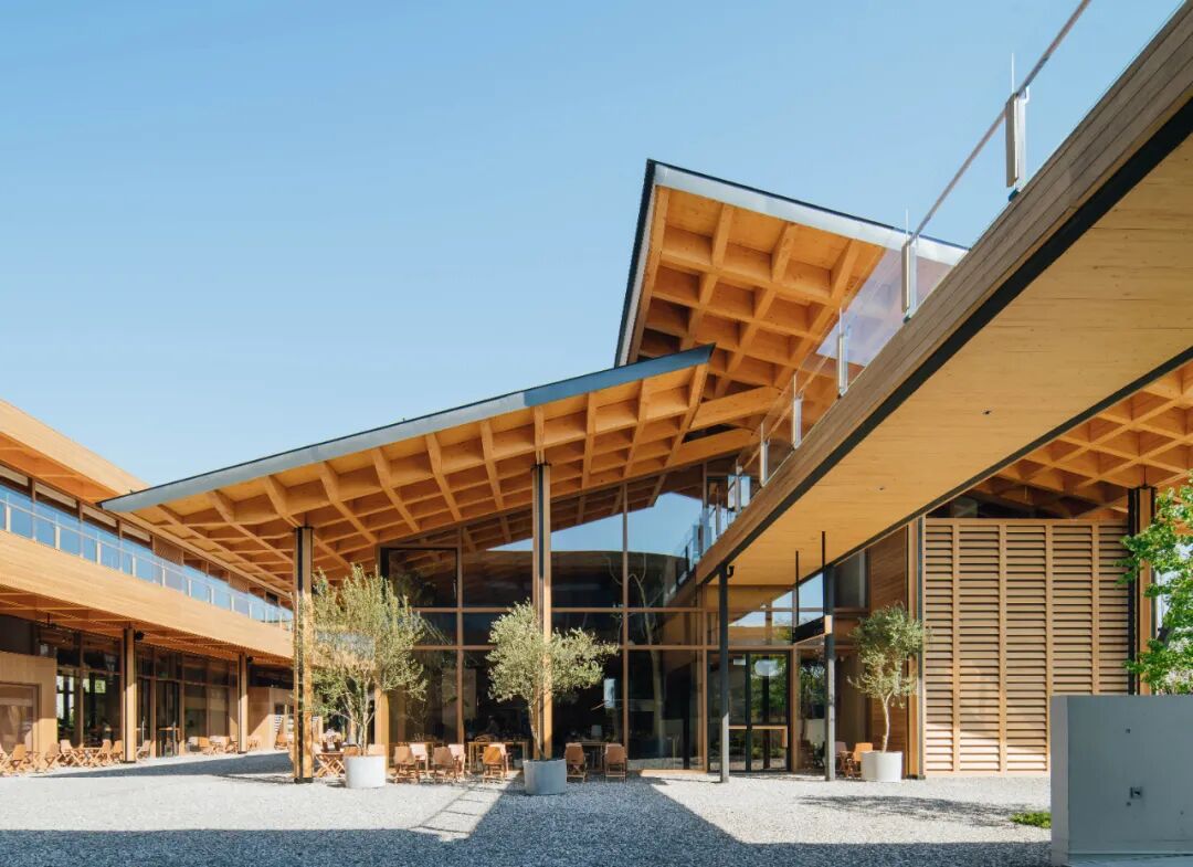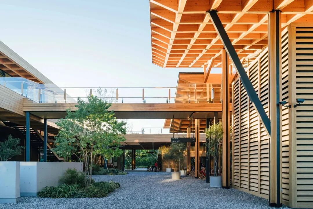 运用自然元素的屋面可以与公园充分对话,连廊为各栋建筑二层之间的交通提供便捷,加强商业氛围感。开阔的露台有绝佳视野,将公园的景色尽收眼底,让人们在远眺中品味美好生活。