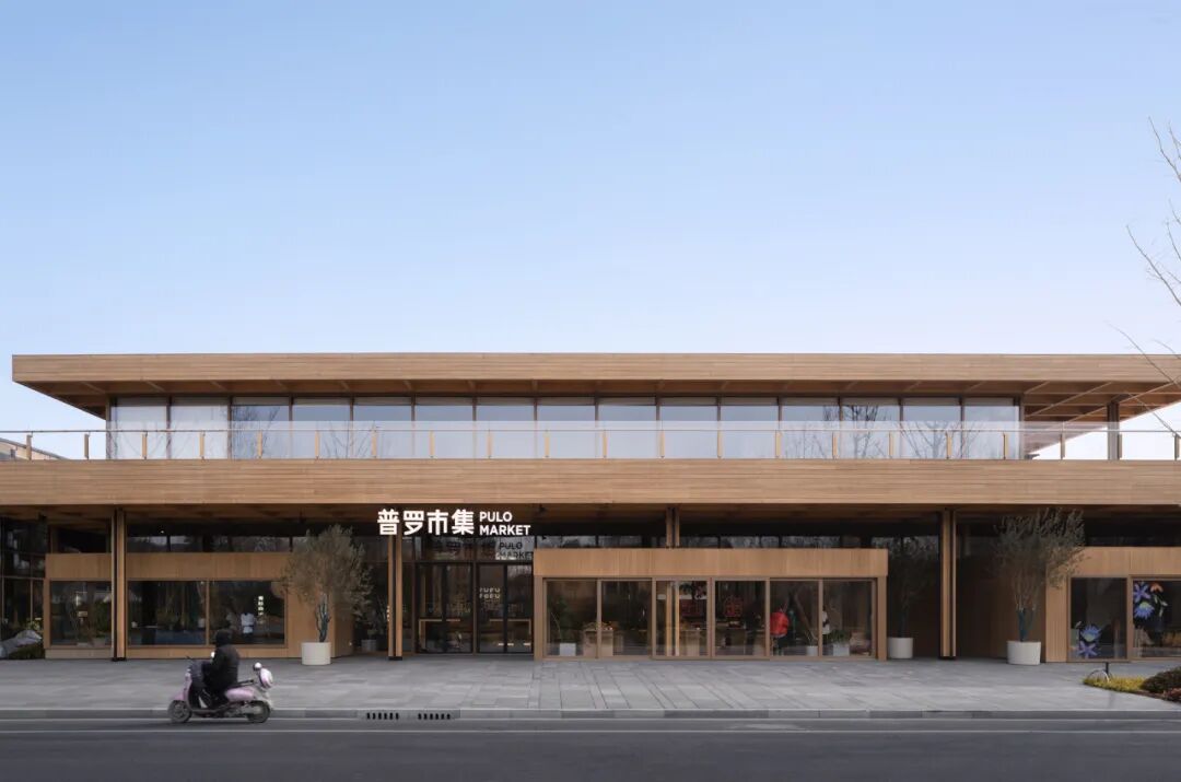 烟火气的营造,从材料选择最初便被纳入考虑。设计摒弃了坚硬冰冷的工业感材质,将具备亲和力的云杉木料作为上选。木质的温暖和柔韧为普罗市集带来社区应该具备的舒适底色,穿插其中、负责结构支撑的黑色钢柱又为建筑整体带来几分冷感,加以调和。
