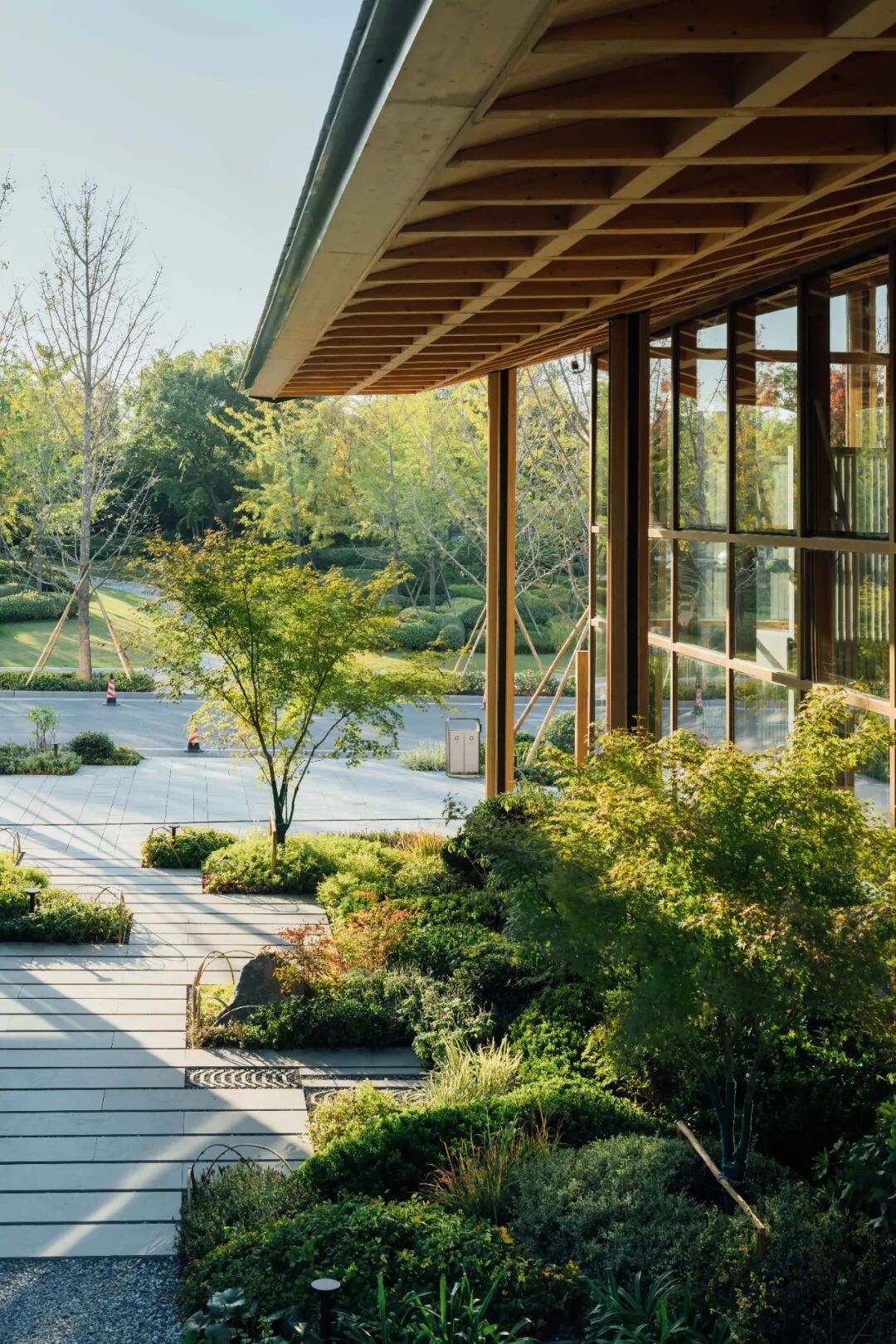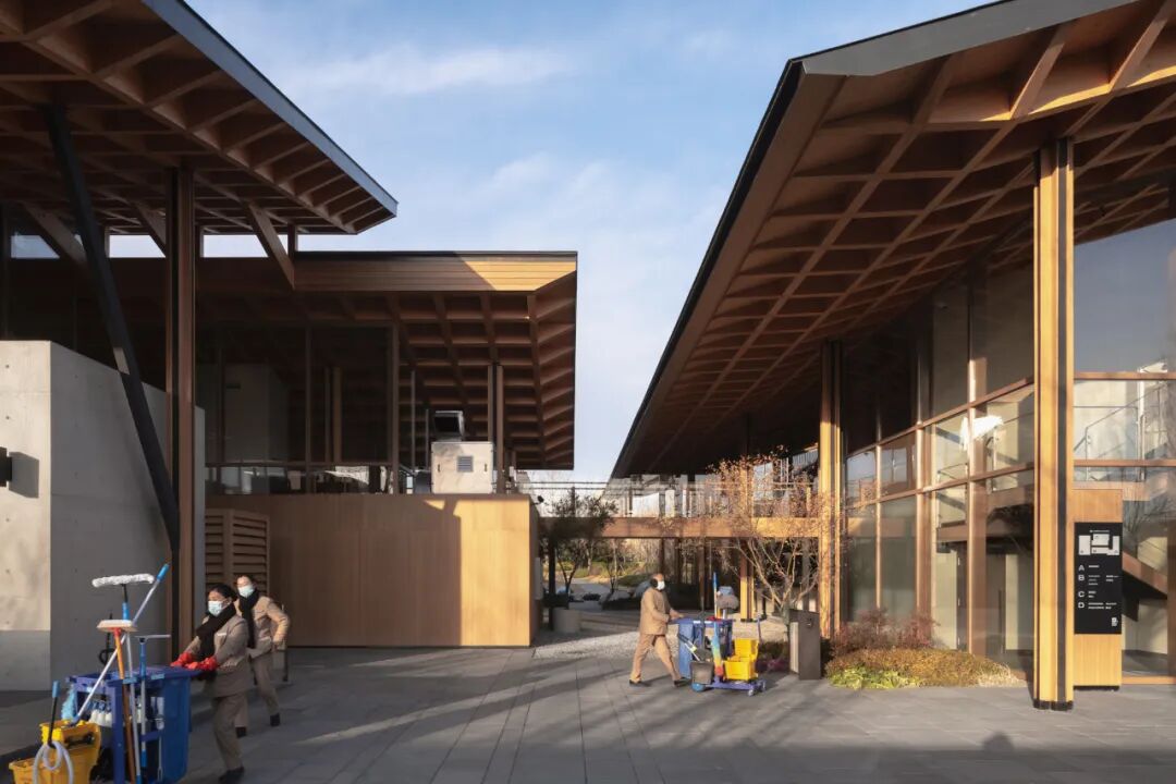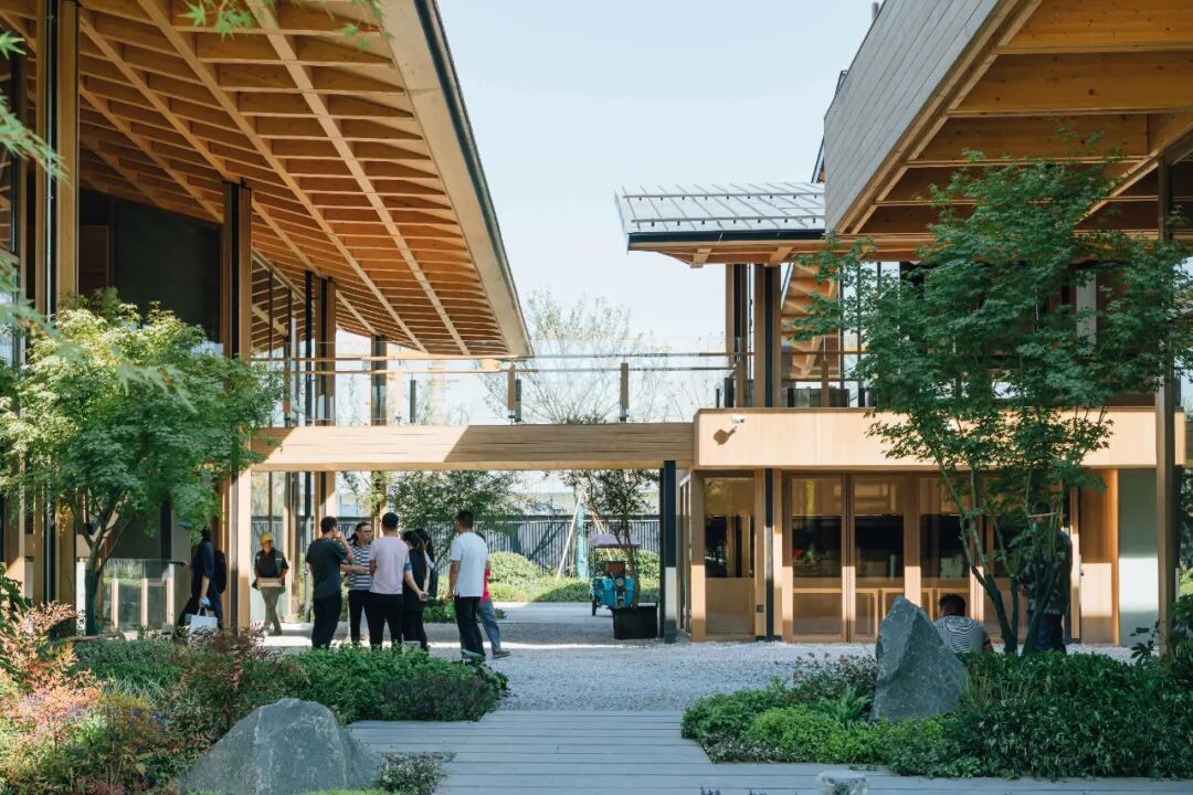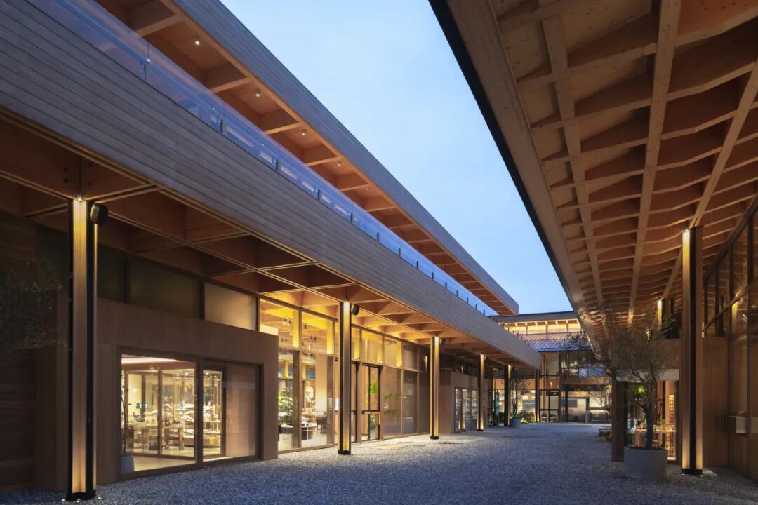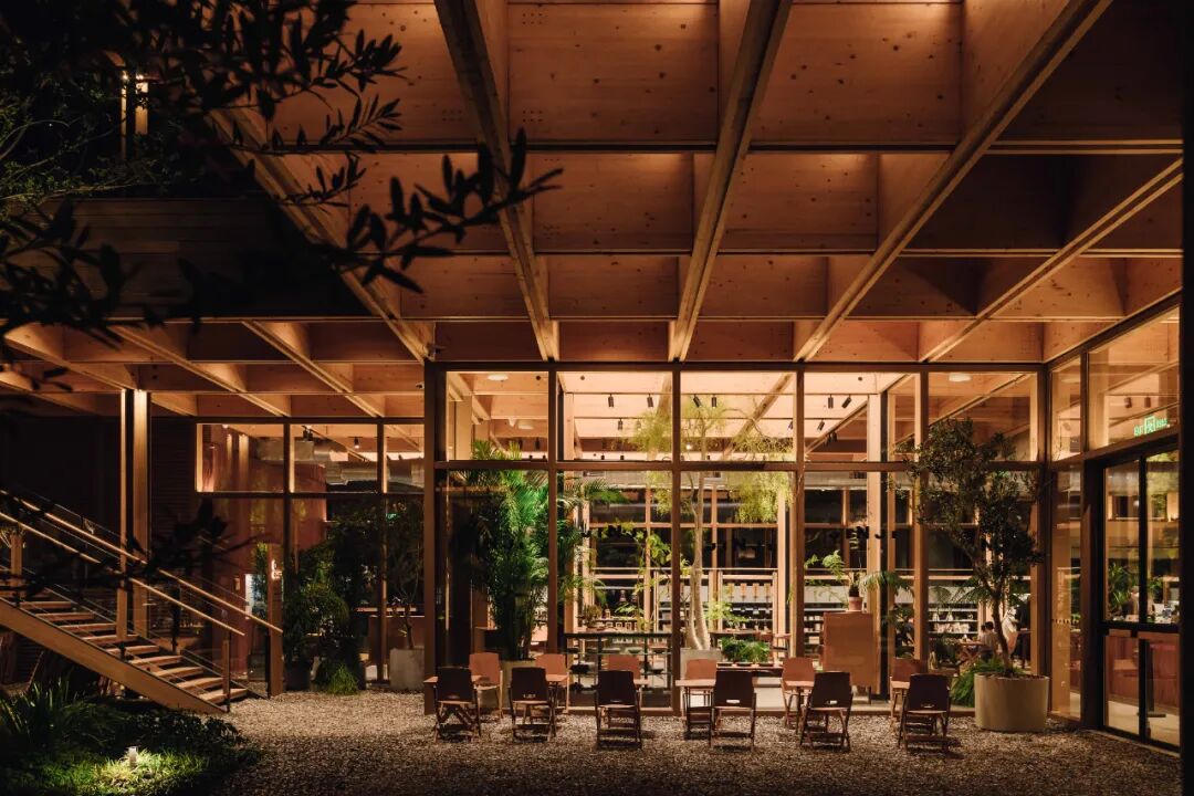 在用地局限、动线交织的基础环境里,绿植难以成林、成片,因而退让与借景成为最重要的设计手法。设计留出商铺展示画面与舒适活动区域,以环境烘托展现建筑木构之美,并在观赏点以花艺手法布置植物,让室内外边界逐步消融。