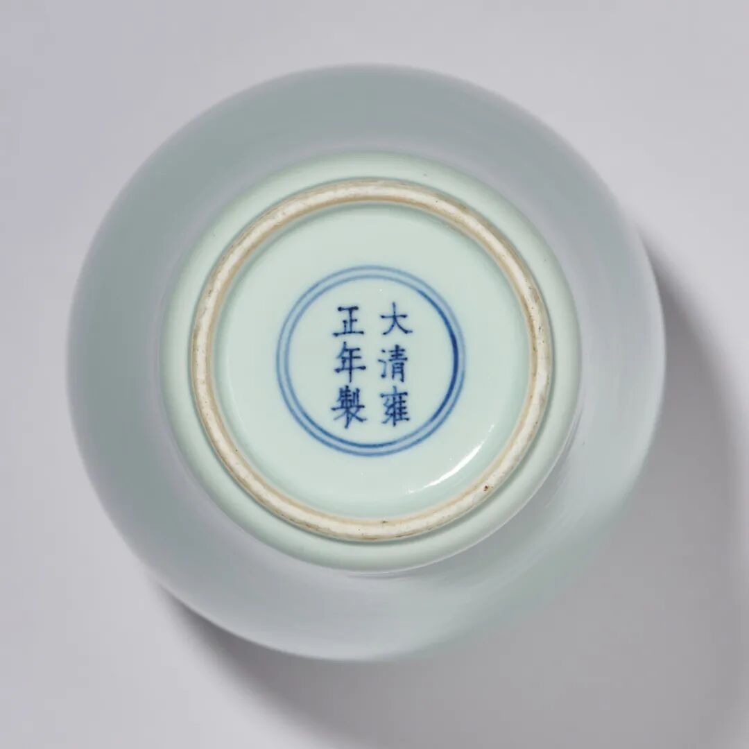 瓶唇口,短颈,宽肩,弧腹,圈足。通体施粉青釉,釉色青绿淡雅,釉面光洁明净,色泽柔和恬淡,丰厚润泽,釉质肥腴,如一汪春水,达到类玉的效果,为青釉中最佳色调之一。釉色与优美的罐体曲线互为表里,可观可赏,不失古韵,又见新意,于穆穆之中透出一股尊贵典雅之气。瓶底内部落「大清雍正年制」青花六字三行楷书款。