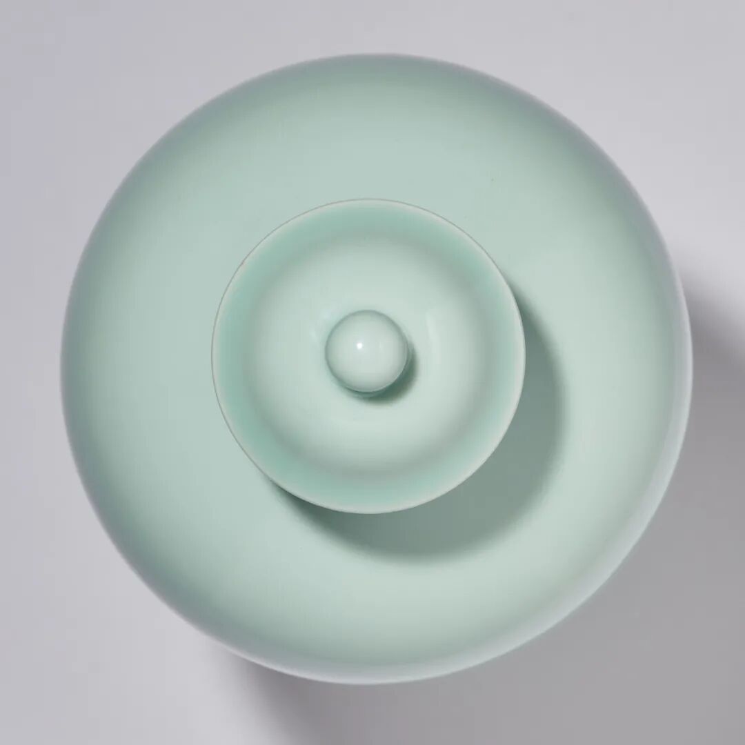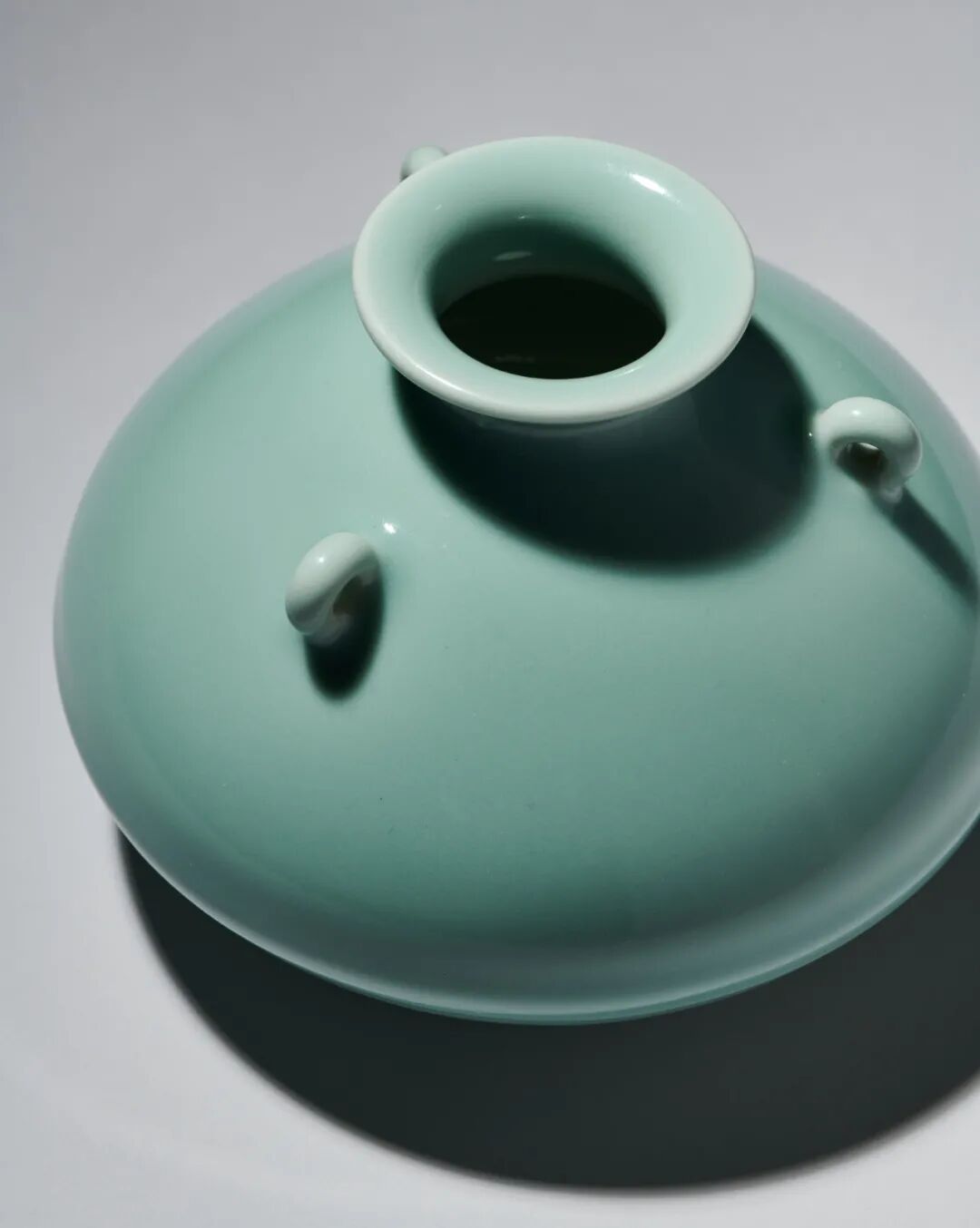 雍正一朝,景德镇御窑制瓷工艺突飞猛进,开发新釉,创烧多样单色釉瓷,亦仿烧前朝名瓷,本品釉色即呼应宋代青瓷雏本。青釉以铁为着色剂,在还原焰中烧制而成,为中国瓷器著名传统颜色釉。亦称「青瓷釉」。最早起源可追溯至商周原始瓷器。其色泽有月白、天青、粉青、梅子青、豆青、豆绿、翠青等。许之衡《饮流斋说瓷》载:「古瓷尚青,凡绿也、蓝也,皆以青括之。」刘子芬《竹园陶说》中说:「青色一种,常与蓝色相混。雨过天晴,钧窑、元窑之青,皆近蓝色。」「惟千峰翠色、梅子青、豆青、乃为纯青耳。天色本蓝,有时为青。」