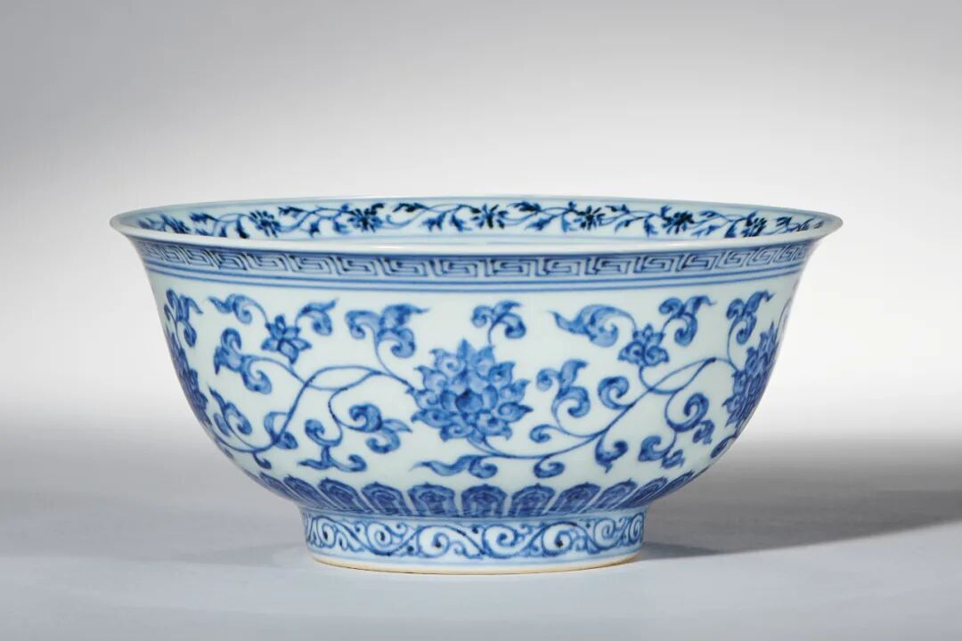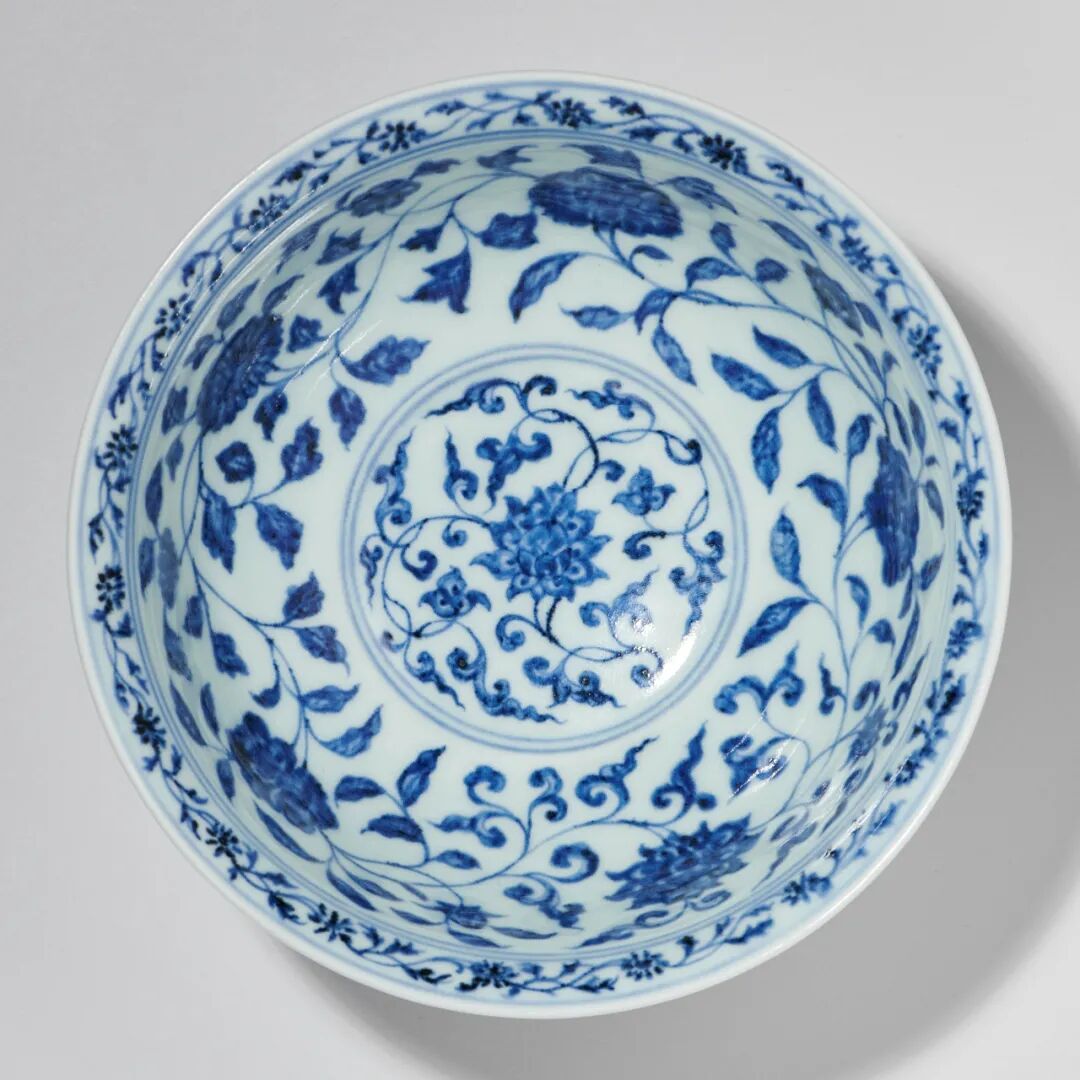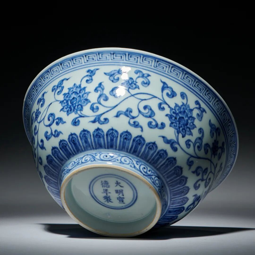 本品侈口,深腹,及底内收,下承圈足。通体以青花为饰,外壁绘以缠枝莲装饰,婀娜妍丽,缠枝宛转勾连,姿态曼妙,卷叶浓淡有致,生机盎然。碗口内沿饰缠枝朵花,内壁周饰缠枝菊花、牡丹、石榴花、茶花纹,碗心双圈内饰缠枝莲纹。足墙绘饰繁密而规矩的卷草纹。纹饰布局严谨,构图有度,番莲舒展之妍美,跃然于其上,格调清新优雅,绘画水平令人叹止。外底心青花双圈内书「大明宣德年制」六字双行楷书款。