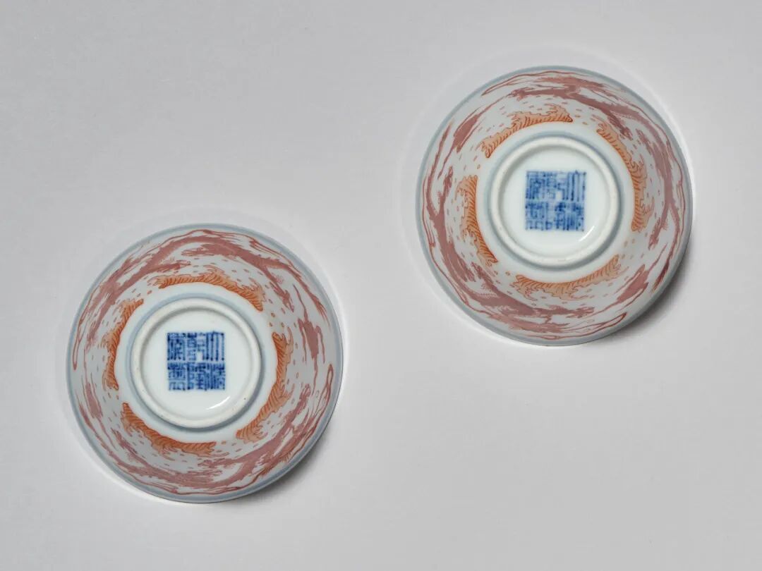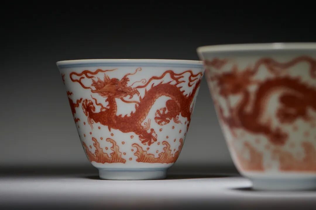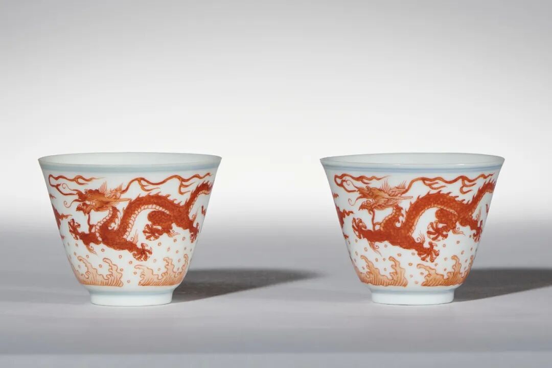 此杯为清代乾隆典型官窑品种,敞口,深腹而小圈足,造型隽秀挺拔,器壁轻薄,迎光可透,通体施白釉,莹润洁净,内壁光素无饰,外壁用矾红彩绘海水云龙纹,口沿与足胫处有双圈青花,矾红双龙矫健威猛,二龙周身布满火焰云纹,游于滔滔海水之上,一龙伸爪抢珠,一龙回首相望。与后龙相互呼应,矫健威猛,五爪锋利。