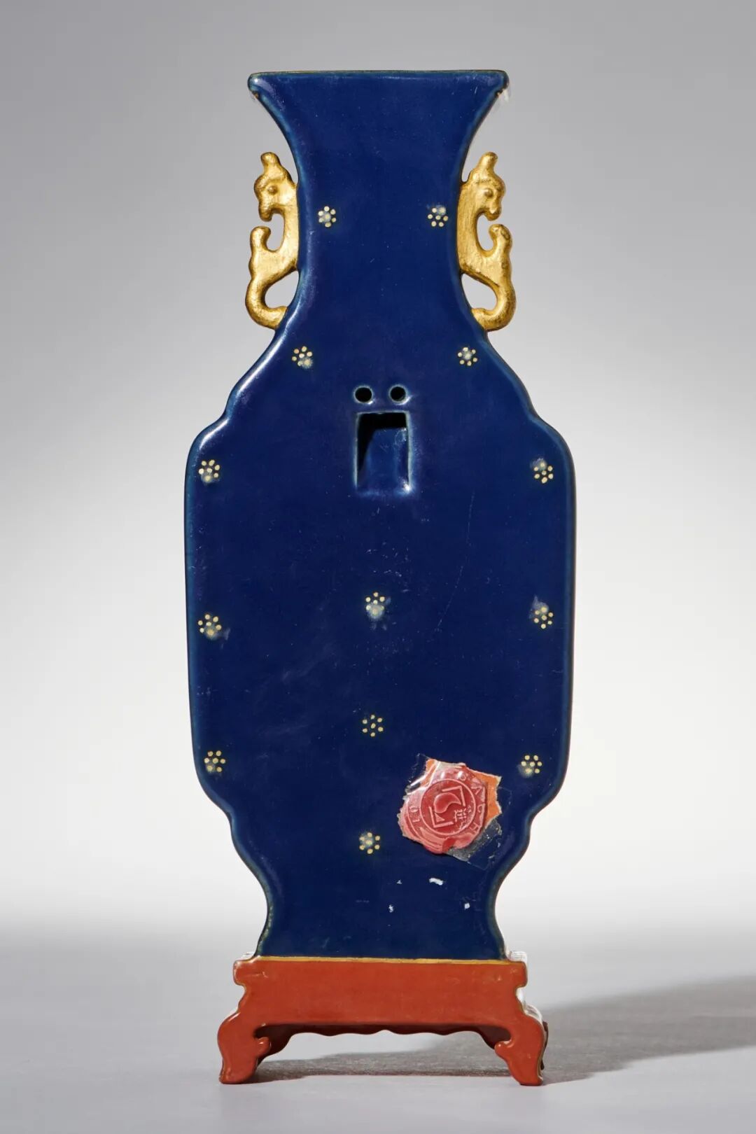 全器如纵剖半器,盘口外撇,直颈,两侧各塑螭耳,直腹,器面微鼓,撇足,下承仿木座,背面平坦,有孔可穿固定于墙面或轿子之内,故有壁瓶或轿瓶之称。器底红地金彩篆书「大清乾隆年制」六字横款。