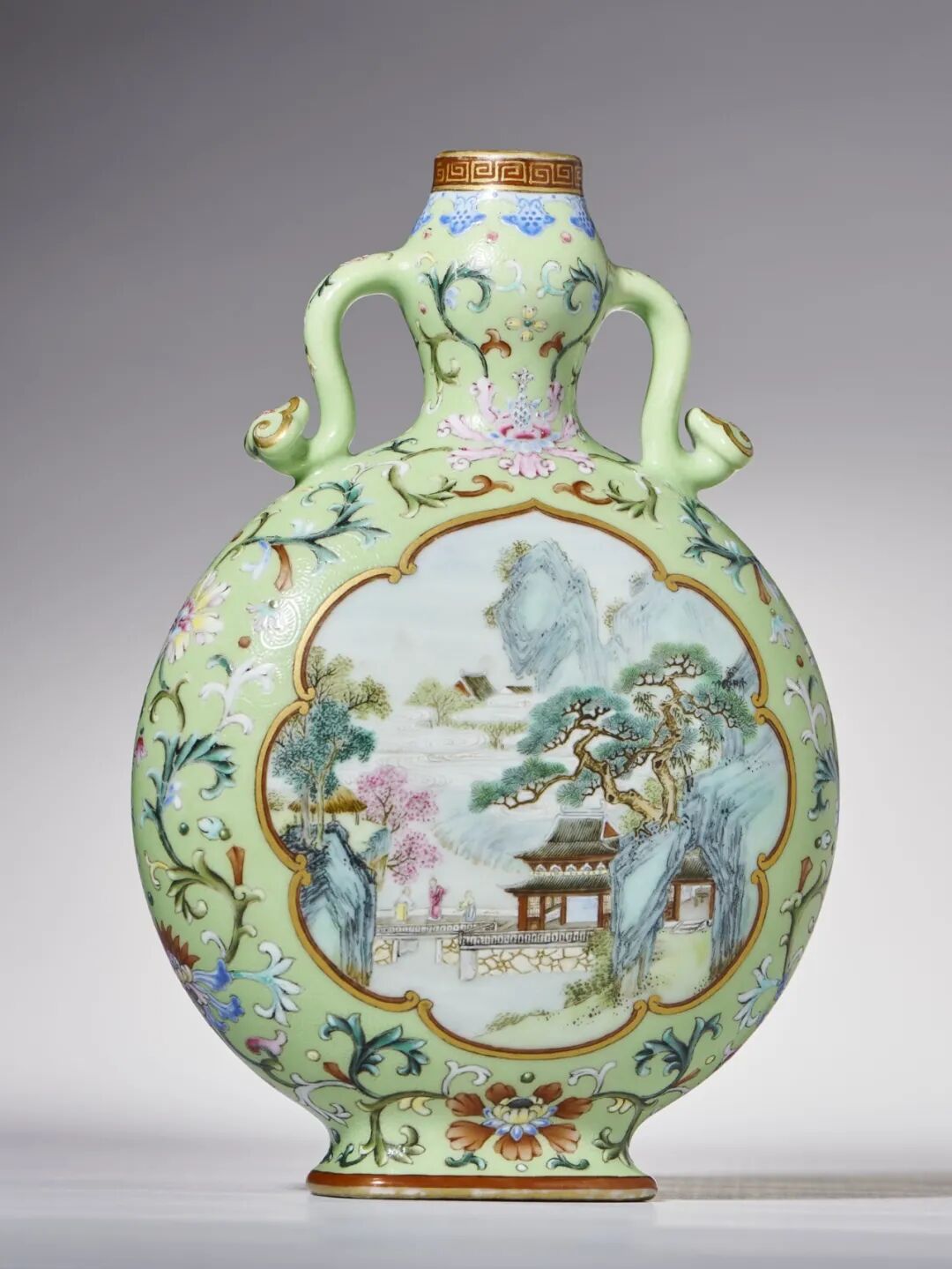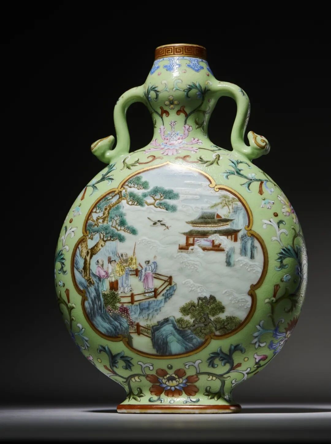 乾隆一朝堪称中国彩瓷发展之巅峰时代,所带来的技术突破与艺术新姿采均在中国艺术史上留下浓重的一笔。诚如《陶雅》所称:「至乾隆,则华缛极矣,精巧之致,几于鬼斧神工。」其中扁壶一式化裁于永宣御器,其形典雅尊贵,透出皇家独有气派,深为乾隆皇帝喜欢,多次谕旨唐英为之烧制,存世所见品类繁多,纹饰图案亦丰富多彩,可见当年烧造之盛,是为乾隆朝御瓷摹古与创新于一体的典范。