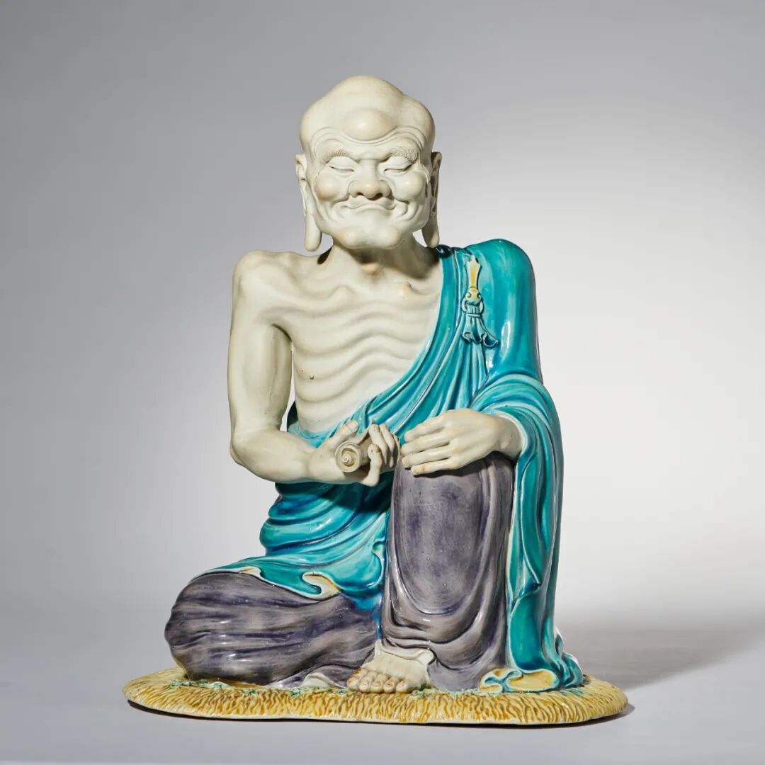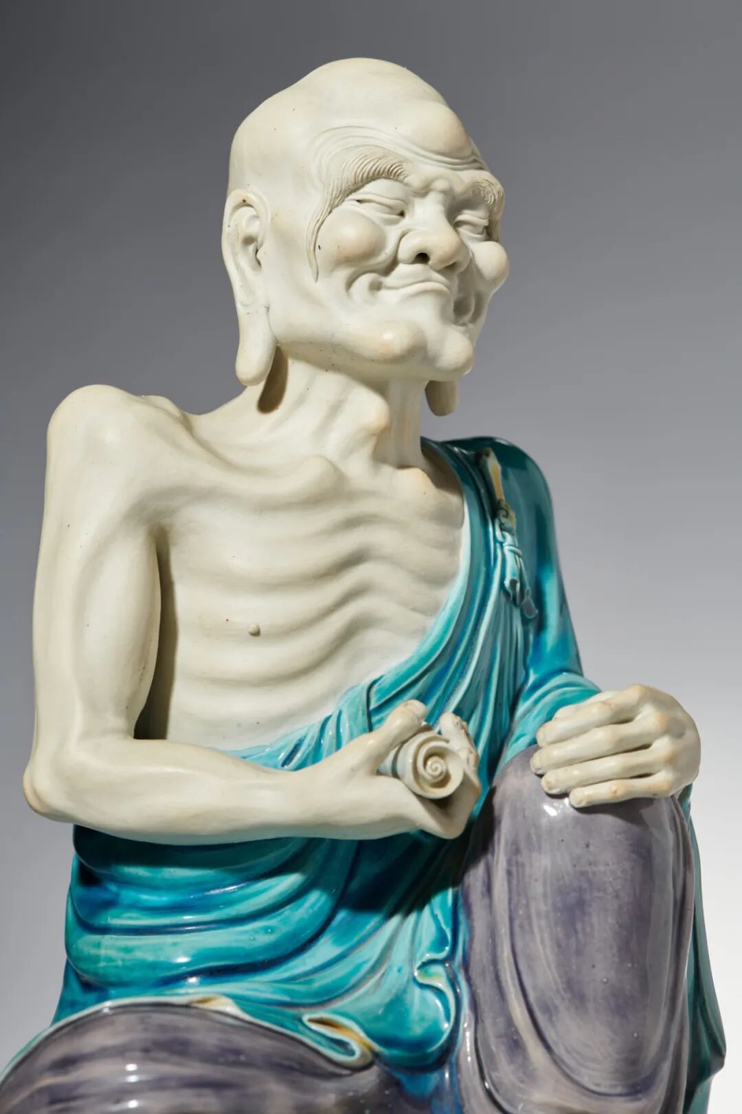 罗汉单腿盘起,单坐于底座之上,面带微笑,身着僧袍,衣纹皱褶洒脱流畅,层层叠压垂下,手握书卷,彩绘精湛,形像生动传神,为清代雕瓷人物中之精品,十分罕见。此罗汉像瓷胎洁白细腻,人物生动传神,身体比例匀称,色彩鲜艳而不失沉实。