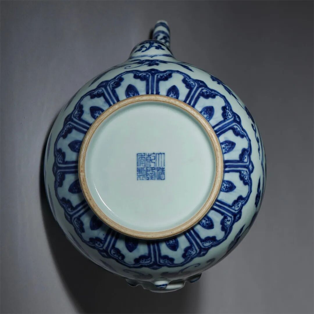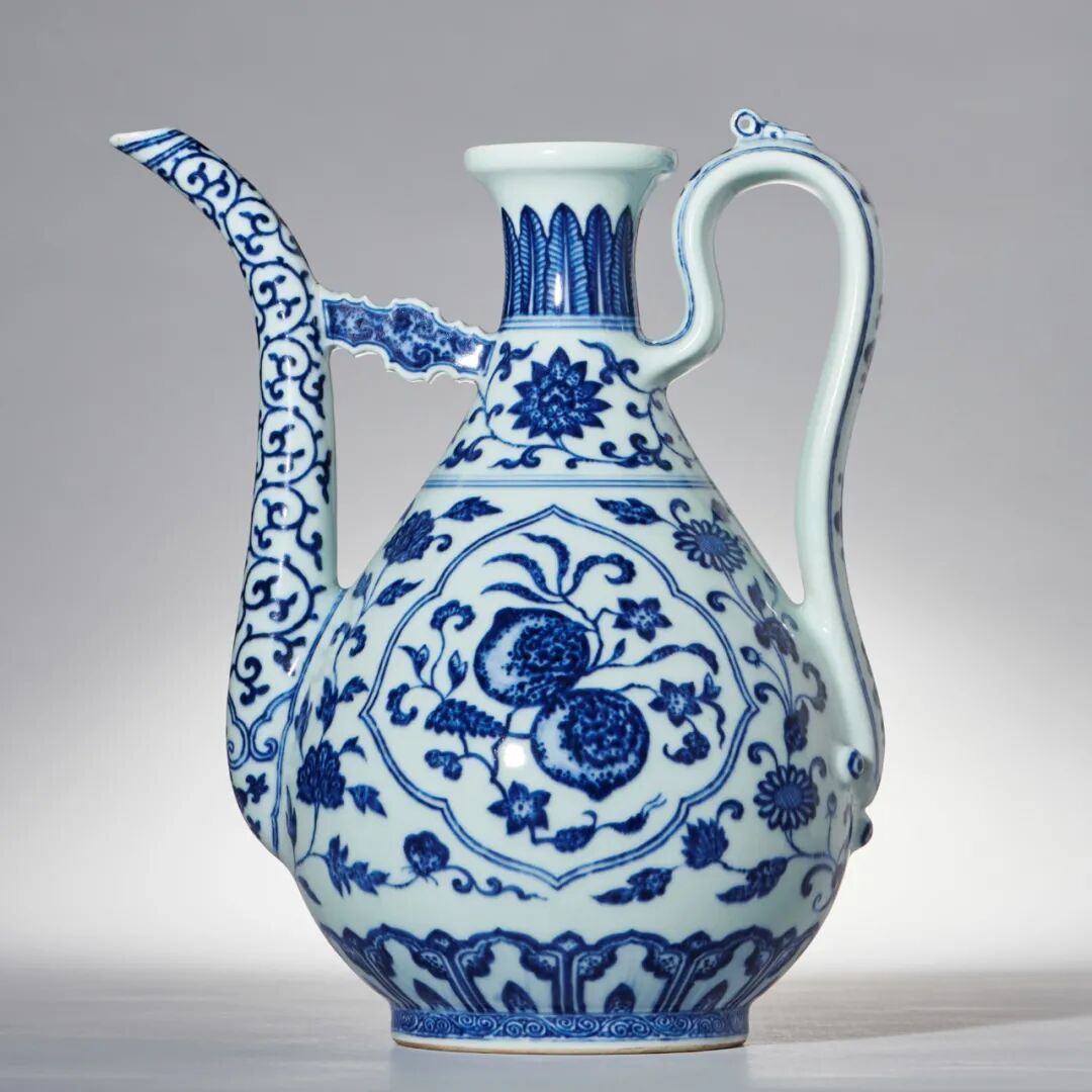 此式执壶原型为西亚波斯银制执壶,后经永乐御窑化裁为此充满异域风情的青花瓷壶。雍乾二帝对永宣青花的苍雅深沉极为倾慕,曾多次亲命景德镇御窑厂仿烧,此式执壶既是乾隆御窑摹仿永乐青花执壶原样而制,颇得永乐御瓷纤巧柔美之风姿神韵。
