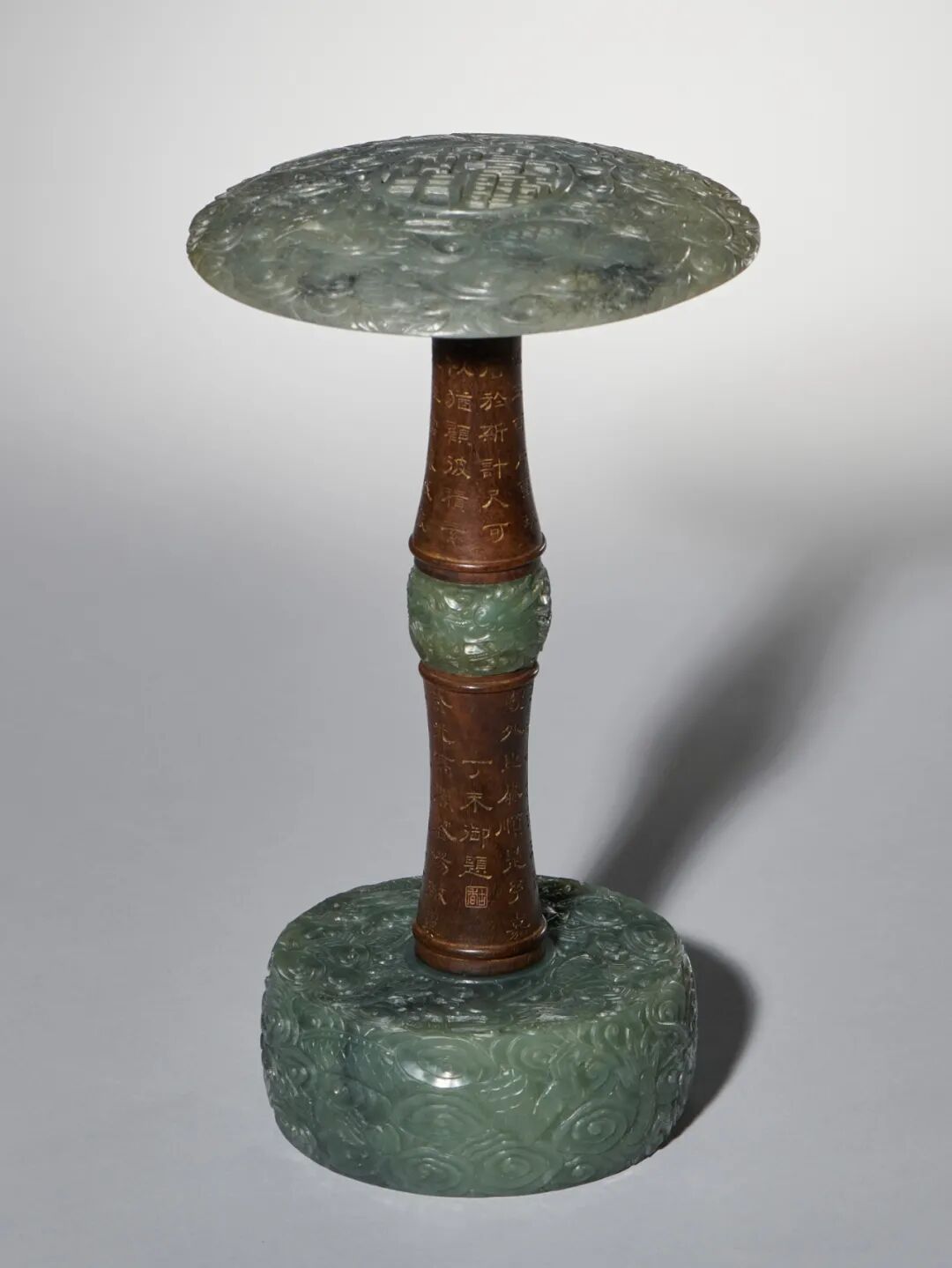帽架由帽伞、柱身、玉托三部分组成,且三部分皆分体制作完成后再组合为一体。除柱身外皆以上等青玉为材,帽伞呈半球形,浮雕盘龙,龙身盘旋,翻云吐雾,气势如虹,龙之威严毕现,盘旋于整个伞面,龙须分于鼻梁两侧,龙鳞刻画逼真,帽伞边缘刻有如意云,龙之威严毕现。中部柱身被玉托分作竹节状两部分,柱身皆填金字乾隆御制诗句,帽架顶部有「乾隆御用」四字篆书款,可做本品为宫廷玉作之佐证。圆形底座亦以整块青白玉雕成,玉面雕云龙纹,二龙首尾相接呈追赶状,龙身隐现云间,与帽伞遥相呼应。