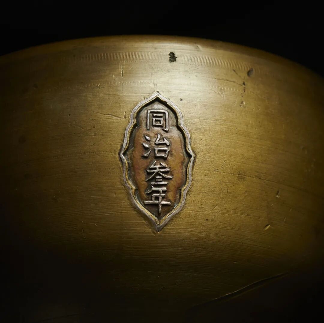 有清一代,乾隆皇帝极力推崇佛教,因此彼时宫廷制造的不论内用亦或赏赐各地寺庙的佛教法器数量较多,存世的乾隆时期的各式佛器即可说明当时佛事之盛。同治时期的佛钵较为少见。处清末之世,以精铜为材,形制丰腴,用料颇奢,当属宫廷之作。另1864年,同治帝方年幼,大权独揽的慈禧太后笃信佛教,下令制造法器以用于重要的佛事活动抑或颁赐佛刹,当非罕事。此钵应为同治初年由慈禧授意铸造的佛器之实例。去今百又五十余载,兴衰更迭不能掩其美质,置之斋中,顿生禅意。