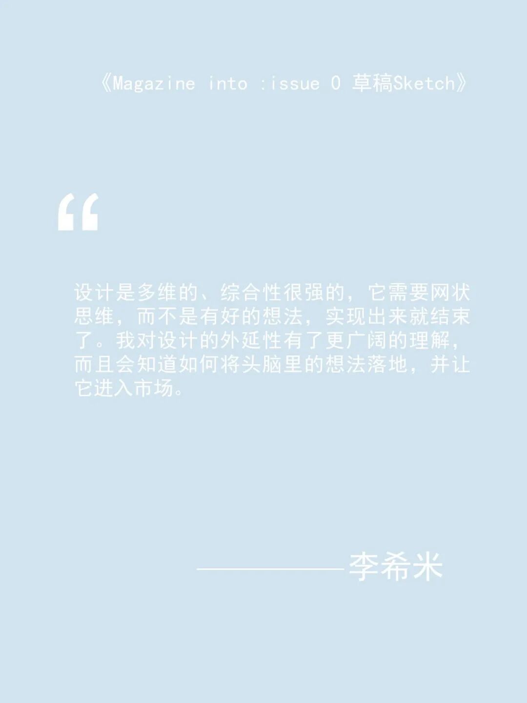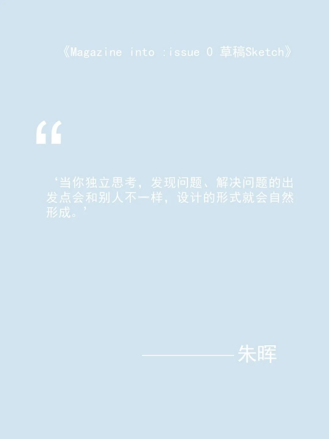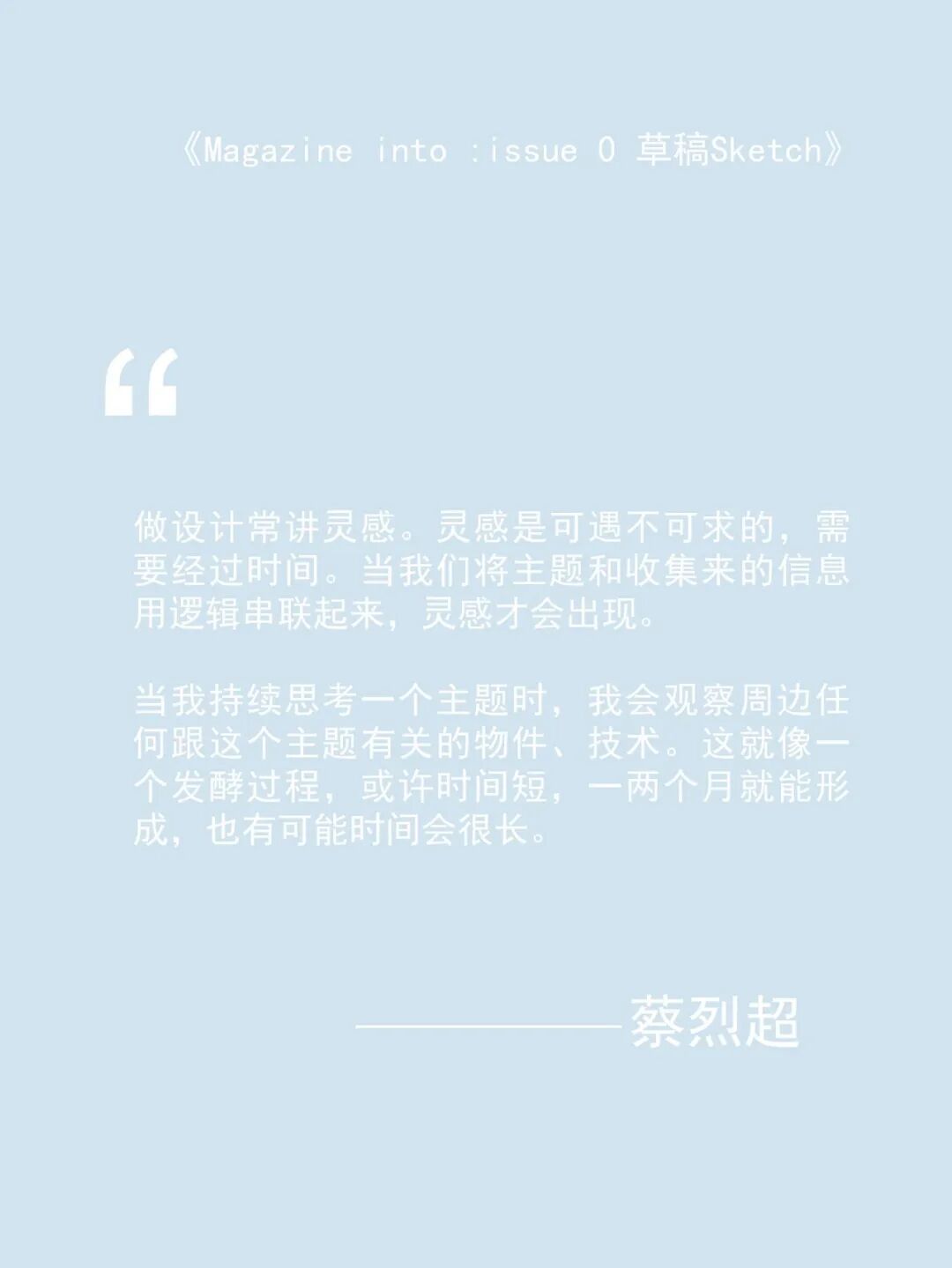 《magazine into:issue 0 草稿》想探讨“设计的价值,尤其在当下中国的设计价值。这本杂志搜集了5位中国设计师(蔡烈超、朱晖、李希米、林宇鸣、沈宝宏)的真实手稿、产品研发过程的原始材料。随着“ 手稿”、“ 材料”、“ 叙述”三个版块的展开,一步步接近答案,从客观的角度去记录幕后的故事。