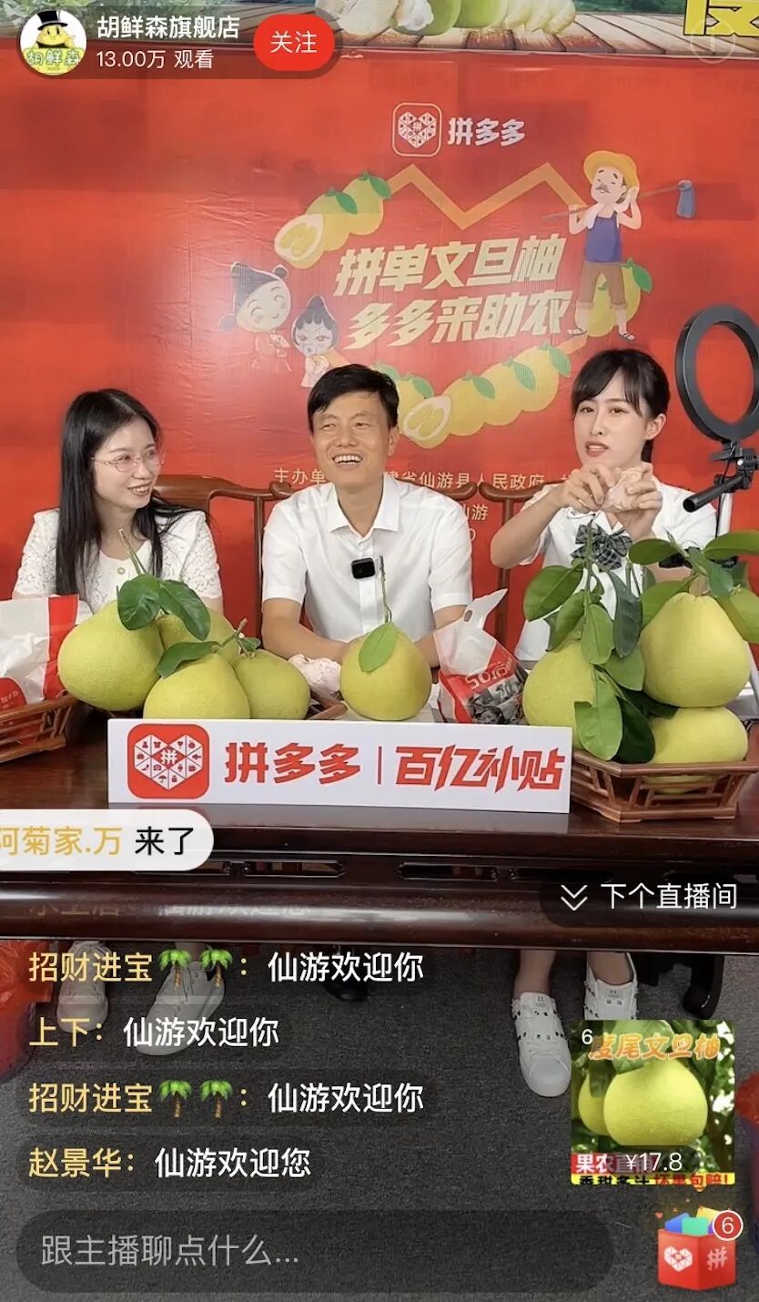 福建省仙游县副县长可以在拼多多助农直播间,全方位展现当地国家地理标志农产品度尾文旦柚。