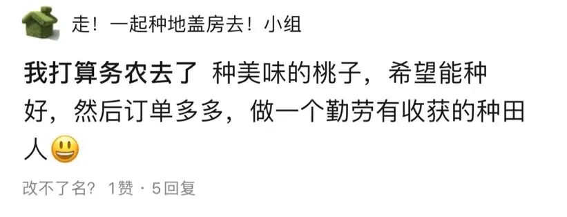 现在豆瓣里连隐居小组都有了,组员一句话对打工人来说是赤裸裸的凡尔赛:已辞职,现在每天种桃子。