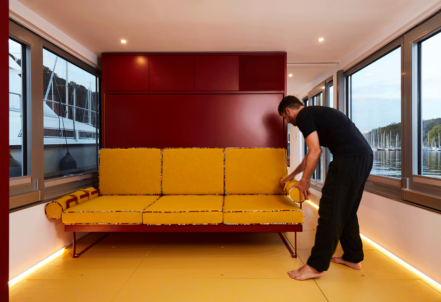 Crossboundaries运用高定制性、集约性和实用性的手段,在这样一个 60 平米左右船屋内,创造了一个流动的多功能船屋空间,能够容纳两个人居住和客人的来访,探讨了微型住宅的灵活性,让每个房间都承担多种功能。