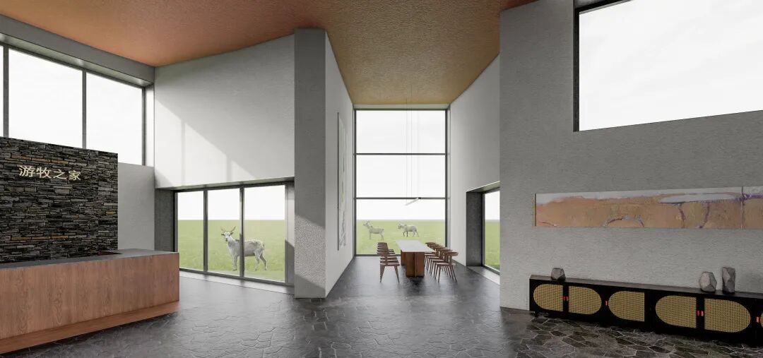 为了适应寒冷地区的气候条件,建筑北侧相对封闭,南侧相对开敞,客厅和客房有着面对草原的良好视野,衬托出草原的水平和广袤。