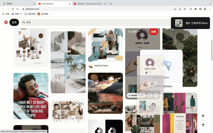 制作灵感库的第一步,就是收集图片。这里可以使用Fabrie采集助手插件进行高效采集。你可以在浏览任何网站时,将自己喜欢的素材转存在Fabrie的素材中转站,然后快速导入到白板上。