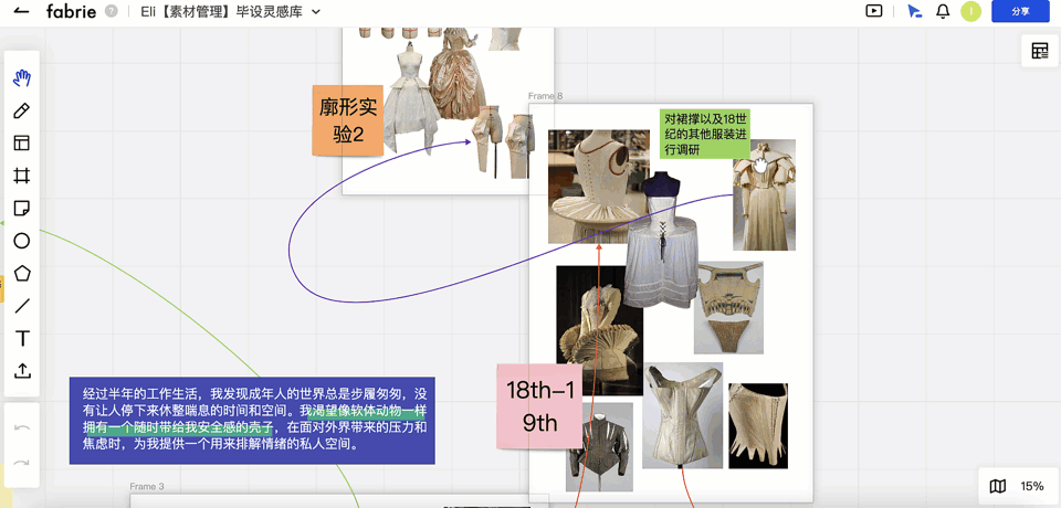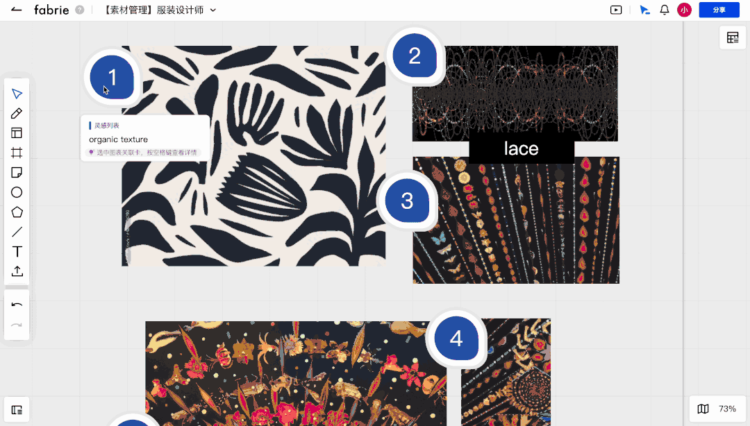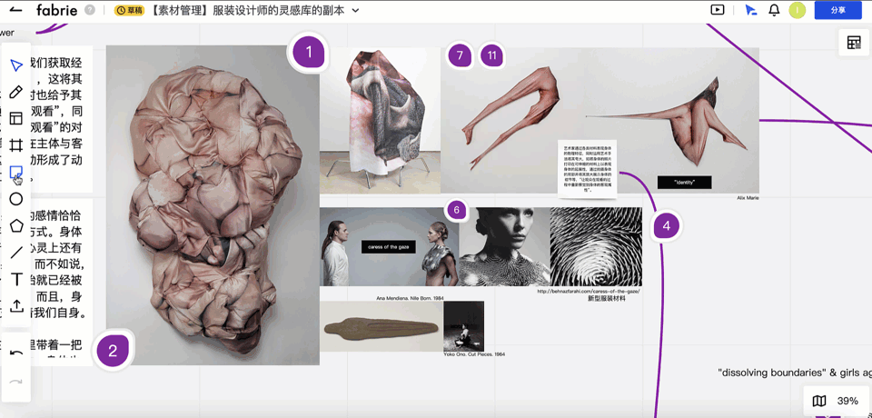 搜集好灵感素材之后,就可以在Fabrie白板里直接开启情绪板的制作,来为你的素材进行进一步的归纳和灵感发散。