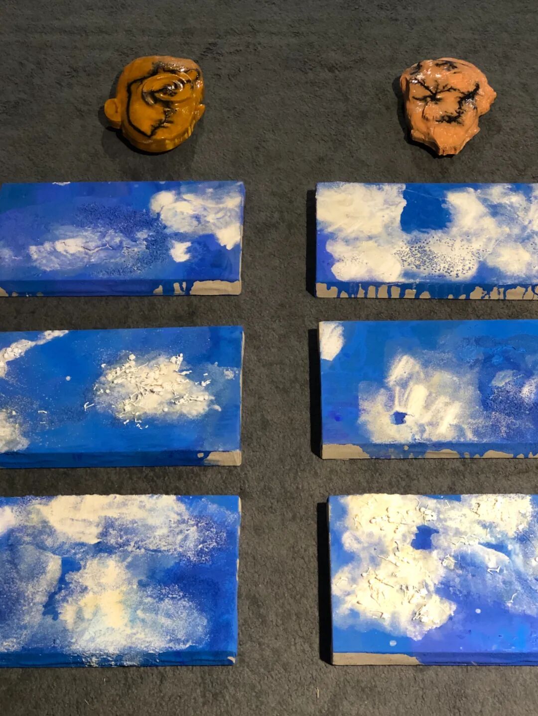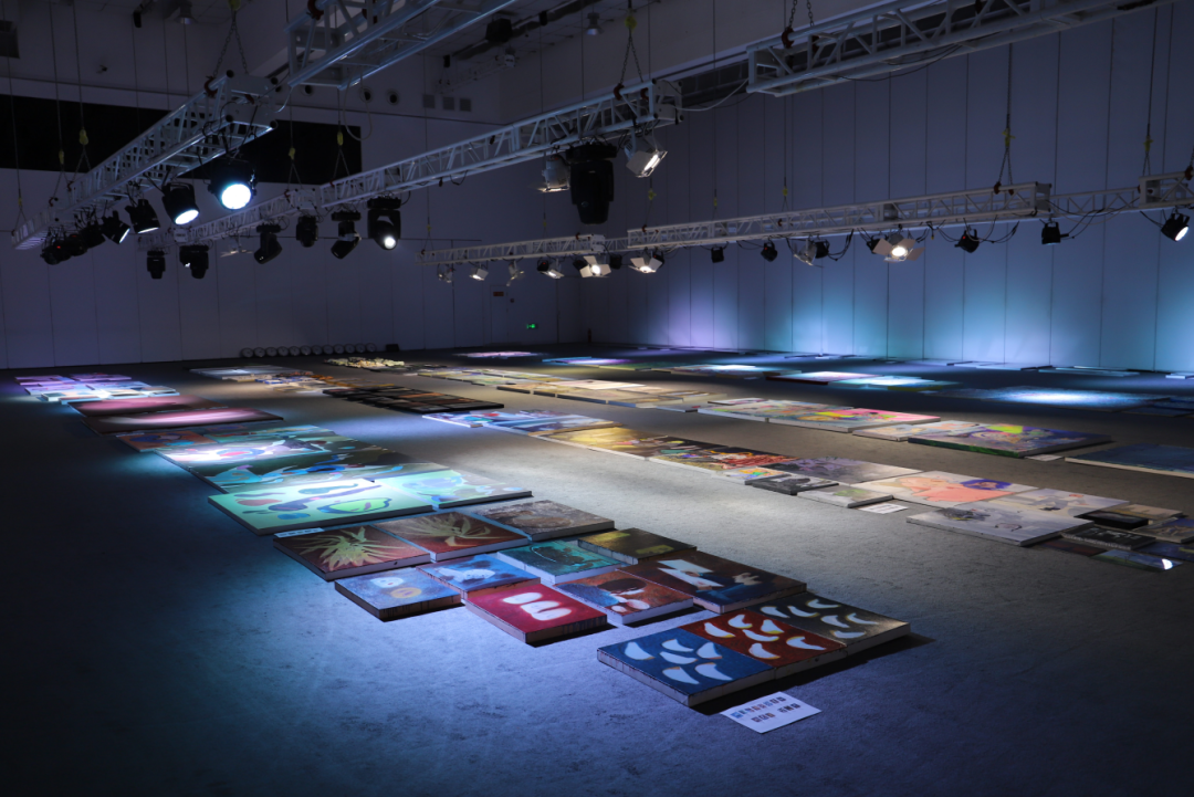 所有作品都平铺在地上,呈现八排,面向前方。现场灯轨被安置在2米左右的高度,从观众的头顶正上方直射下来,光线因此不算均匀,有些作品处于聚光灯中央,但处于边缘的作品身上光线明显不足。光线的问题并不重要,这个活动的现场处处体现出的一种非正式感,而我认为这种非正式感,或者说临时感是很重要的——它让人想起90年代城市中的某些临时性或季节性的书市、地摊、跳蚤市场,还有这些自组织的商业形式中透露出的碎片性、非中心性、非体系性。