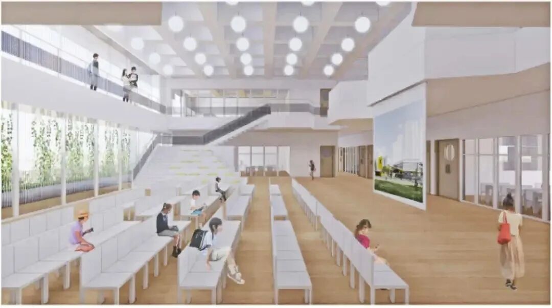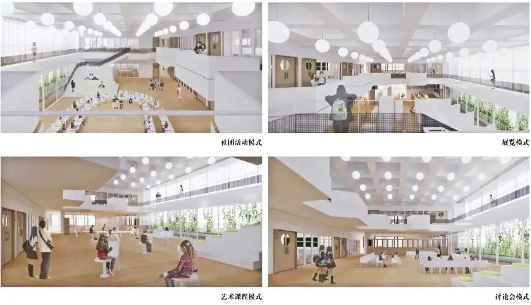 此外,方案还在教学楼内增设可活动墙面,让教室可多重叠加、自由组合,共享使用。学校在组织晚会、展览、美术课、辩论等活动时可灵活运用。