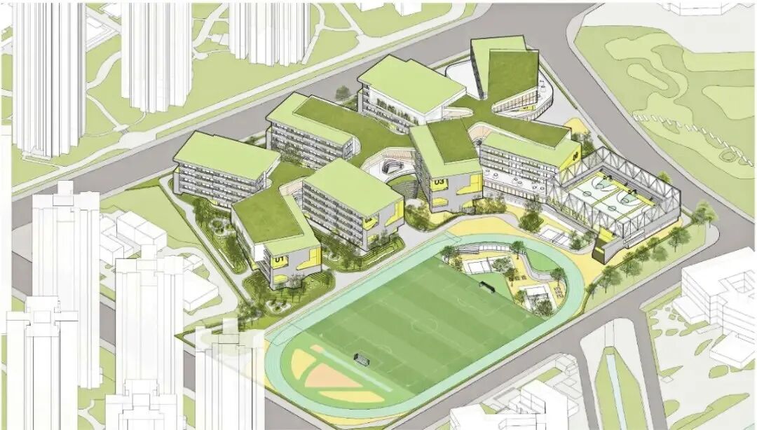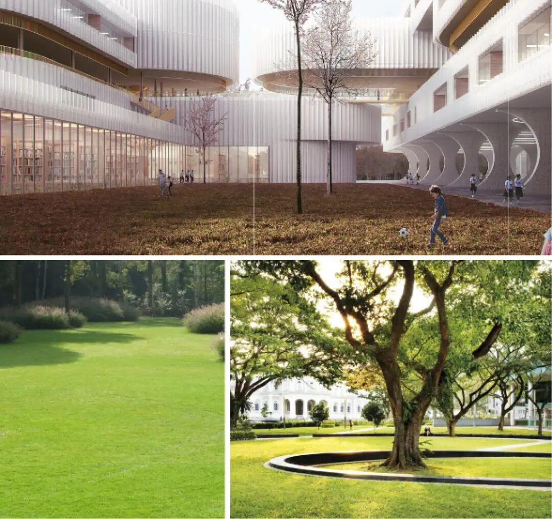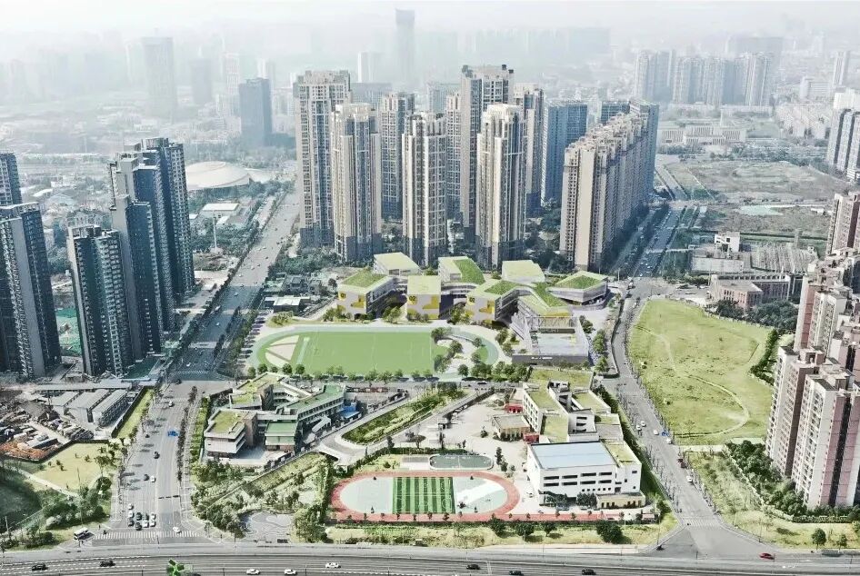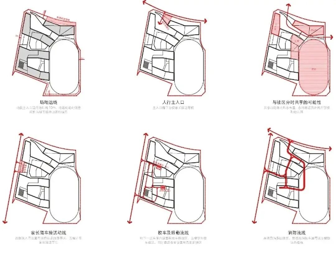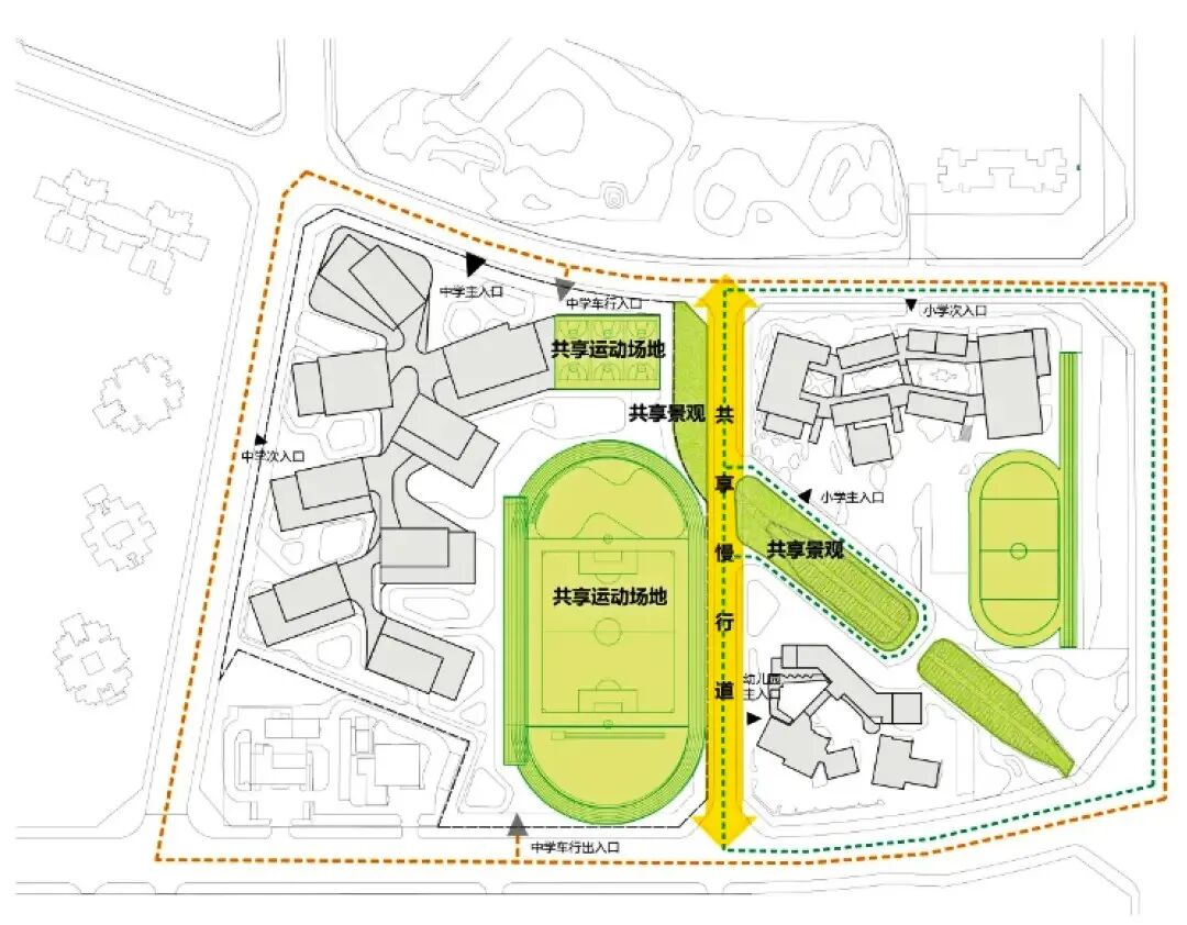 其次,为缓解家长接送孩子时校门口的人员聚集问题,方案将学校主出入口设置在北侧,紧邻城市绿地,为学校形成了一个天然的人群集散场地。