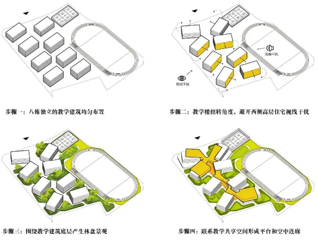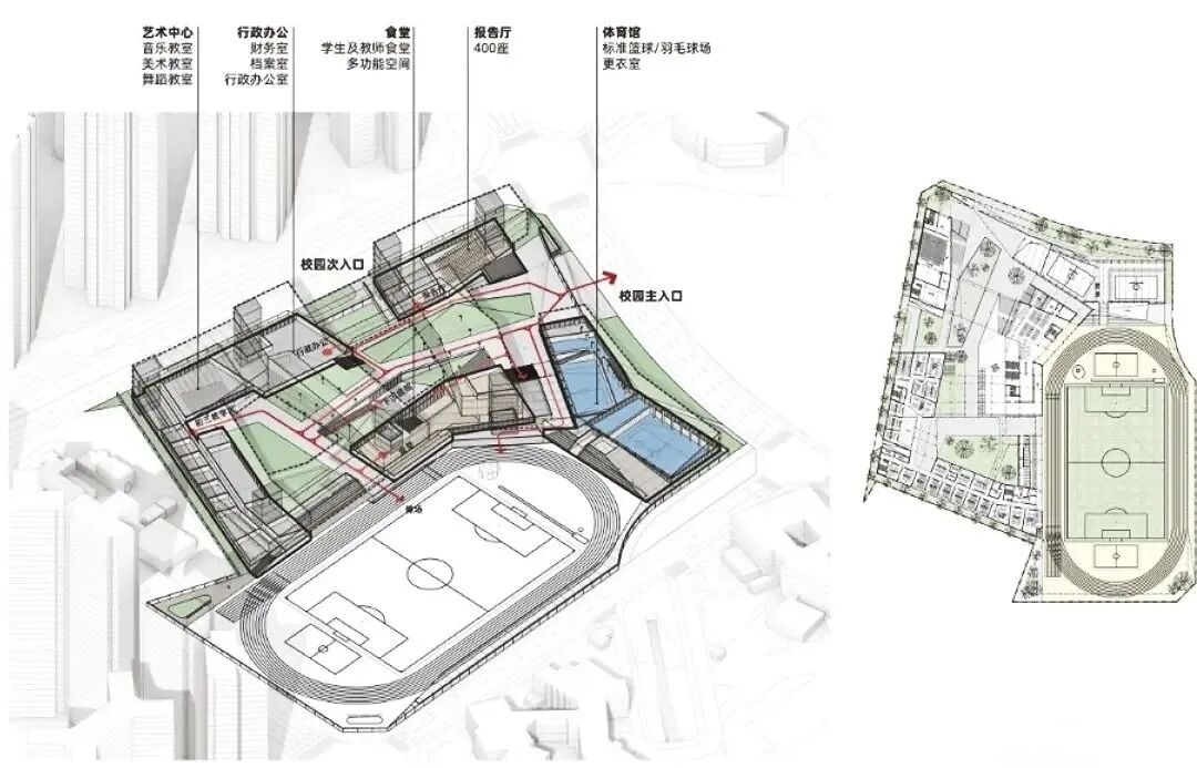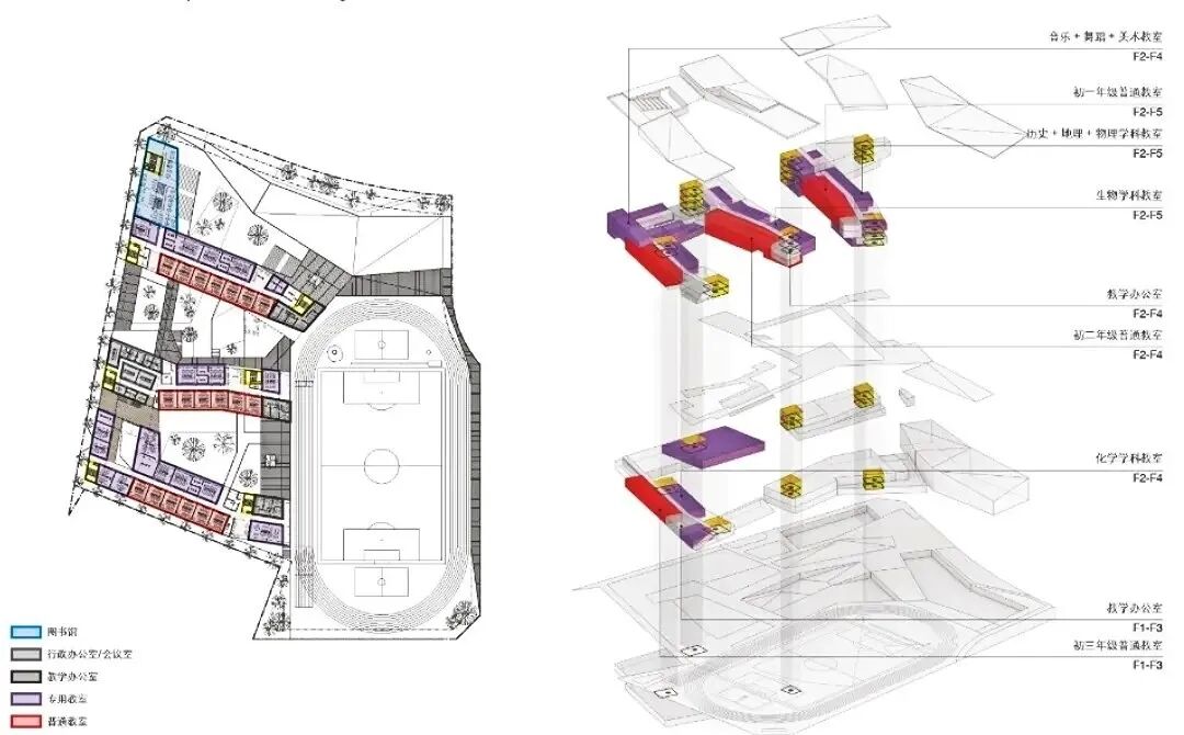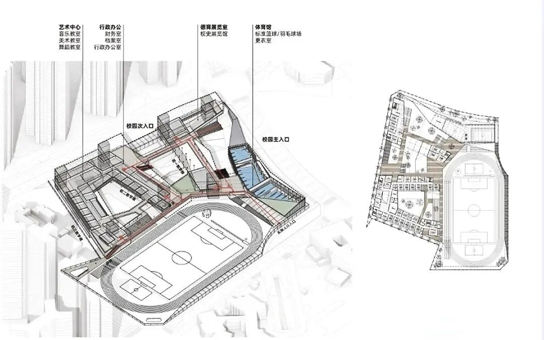 首先,从校内师生上下课活动流线看,方案摒弃传统的学校空间布局模式,按年级平均分配教学面积,把原本分离的教室、实验室、艺术室、计算机教室等混合编排,组合成独立复合教学楼。